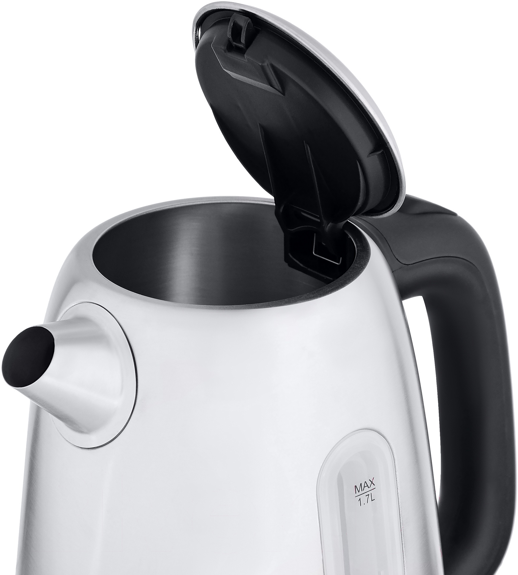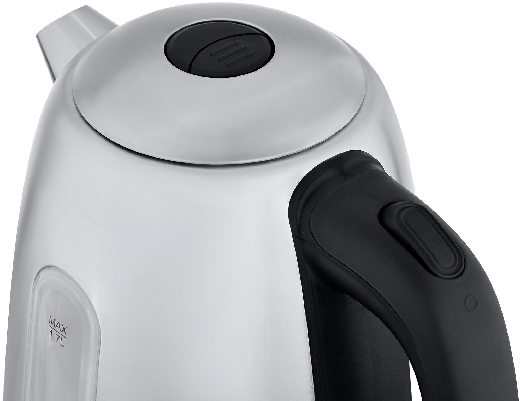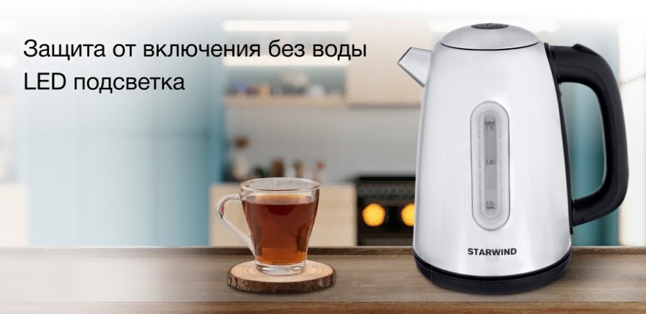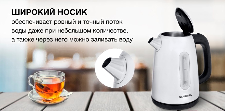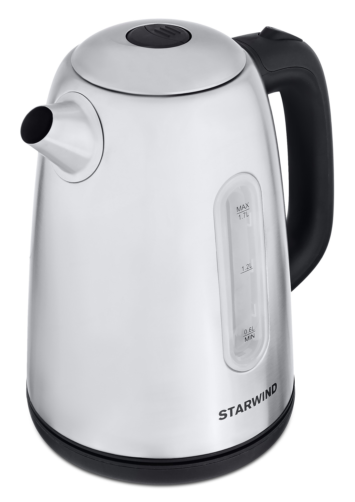 Интересный дизайн, продуманная конструкция, качественные материалы – все это позволит чайнику STARWIND SKS3210 составить реальную конкуренцию вашим любимым бытовым приборам на кухне и вырваться в лидерские позиции. Корпус электрического чайника выполнен из нержавеющей стали и имеет матовое серебристое покрытие. Ручка и подставка изготовлены из черного жаропрочного пластика. Для точного определения уровня заполненной воды предусмотрено смотровое окошко, на которое нанесена мерная шкала: 0,5 л, 1 л, 1,7л. В STARWIND SKS3210 предусмотрен только один температурный режим, для запуска которого используется кнопка, расположенная на ручке прибора. Кнопка оснащена световым индикатором и когда прибор находится в рабочем состоянии, кнопка горит красным цветом. Отдельного внимания заслуживает широкий носик чайника, который выполнен по технологии «непроливайка» и обеспечивает четкое равномерное налитие, без разбрызгивания кипятка за пределы чашки. В электрическом чайнике STARWIND SKS3210 нагревательный элемент скрыт под металлической пластиной, что также упрощает уход за изделием в случае появления накипи от жесткой воды. Мощность в 2200 Вт гарантирует высокую производительность и позволяет закипятить даже полностью заполненный чайник на 1700 мл всего за пару-тройку минут.