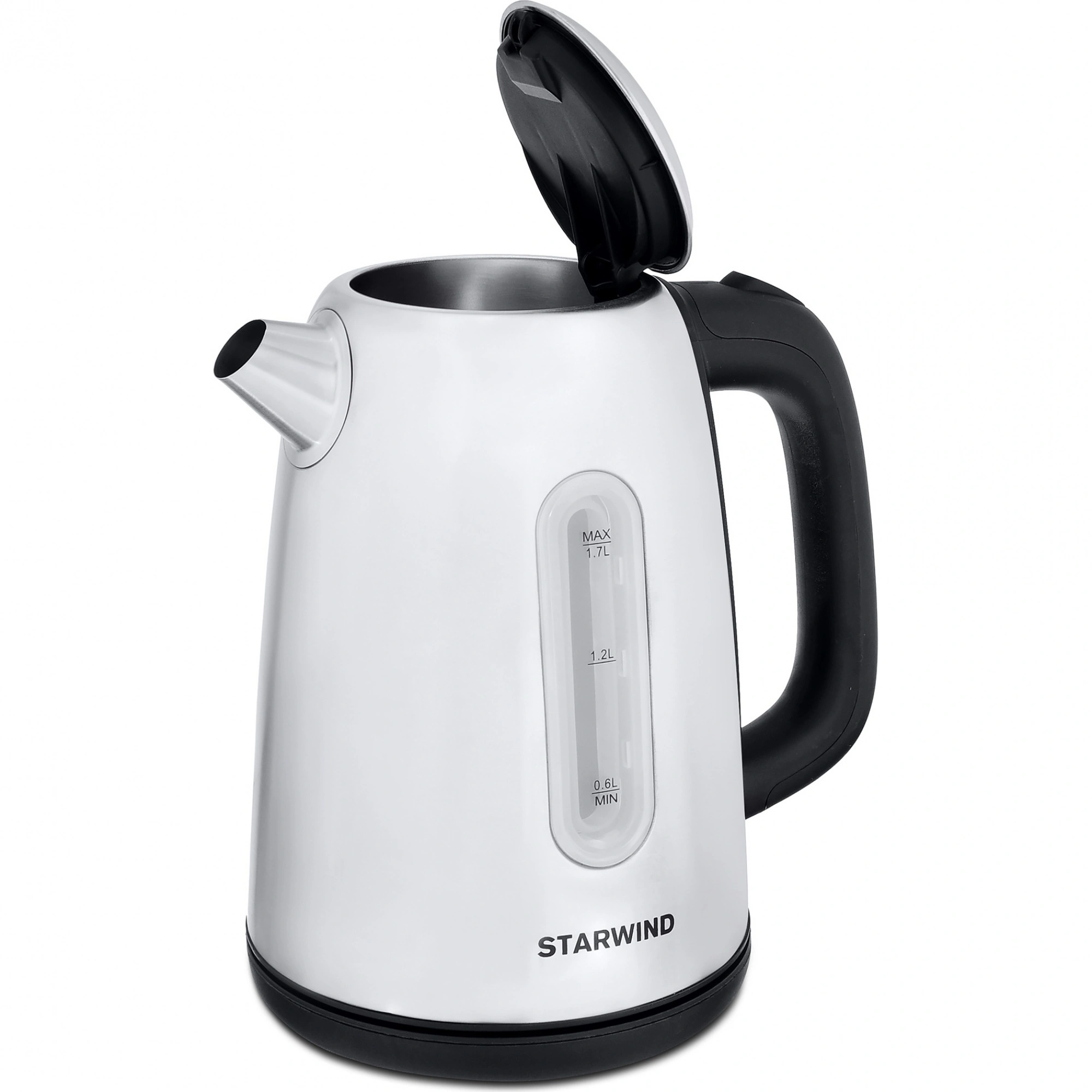 Интересный дизайн, продуманная конструкция, качественные материалы – все это позволит чайнику STARWIND SKS3210 составить реальную конкуренцию вашим любимым бытовым приборам на кухне и вырваться в лидерские позиции. Корпус электрического чайника выполнен из нержавеющей стали и имеет матовое серебристое покрытие. Ручка и подставка изготовлены из черного жаропрочного пластика. Для точного определения уровня заполненной воды предусмотрено смотровое окошко, на которое нанесена мерная шкала: 0,5 л, 1 л, 1,7л. В STARWIND SKS3210 предусмотрен только один температурный режим, для запуска которого используется кнопка, расположенная на ручке прибора. Кнопка оснащена световым индикатором и когда прибор находится в рабочем состоянии, кнопка горит красным цветом.