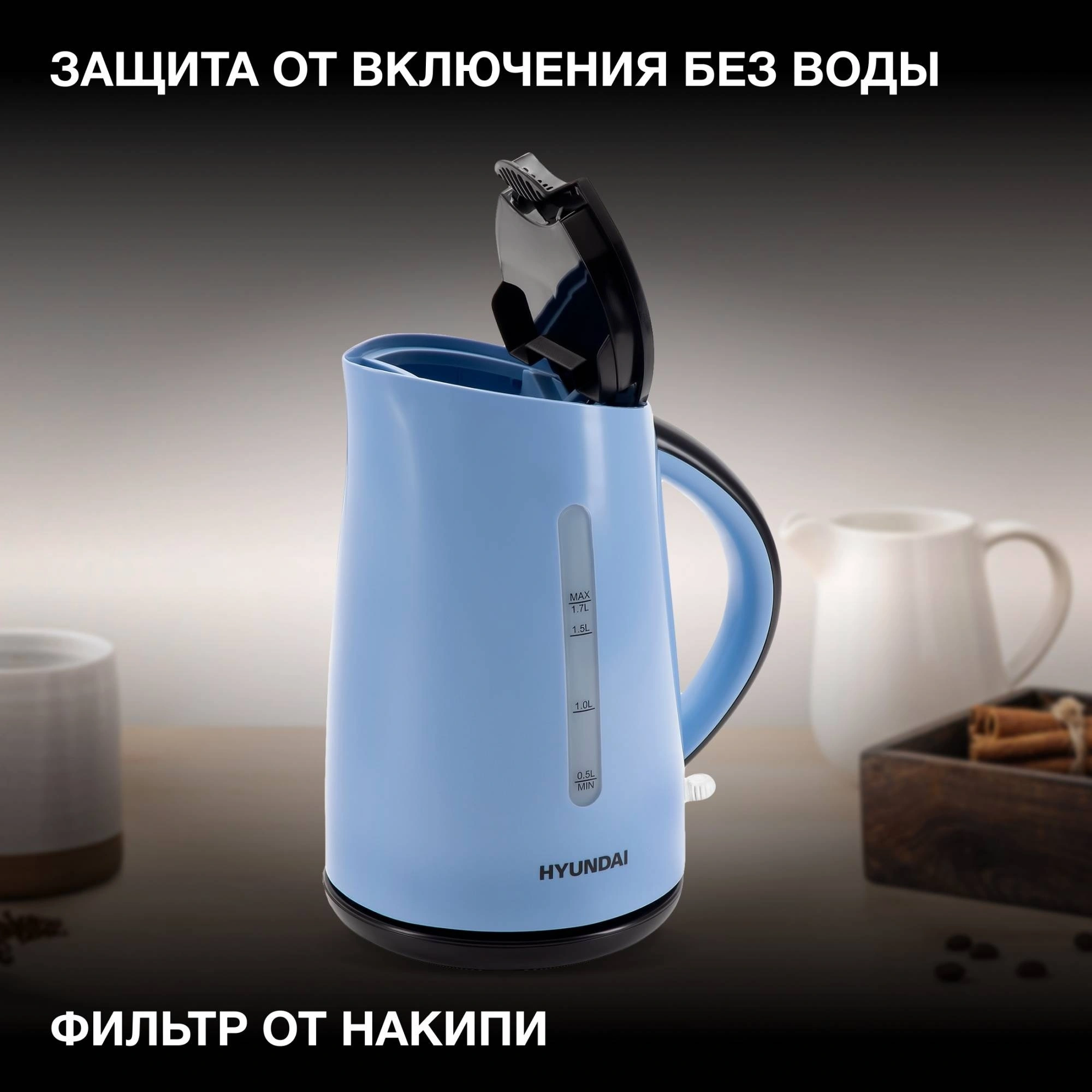 Чайник Hyundai HYK-P2028 имеет минималистичный набор необходимых функций и служит долгие годы благодаря качественным материалам и сборке. Кипяток на кухне нужен регулярно, важно, чтобы его можно было приготовить быстро. С помощью нагревательного элемента мощностью 2200 Вт и контроллера VnQ от британской компании Strix данная модель разогревает до 1,7 л жидкости за считанные минуты. Помимо этого, на вторую деталь действует дополнительная гарантия – 6 лет. Подставка позволяет ставить чайник в любом положении, на ней он может крутиться на 360 градусов. Греющая часть эргономично спрятана внутрь базы. В конце цикла нагрева устройство отключается самостоятельно, это значительно продлевает ресурс детали-нагревателя. Её выход из строя считается самой распространенной причиной поломки электрических чайников. Кнопка включения Hyundai HYK-P2028 располагается под рукояткой, там же находится и индикатор работы. В носике данной модели есть эффективный фильтр с мелкой сеткой, чтобы отсеивать накипь. Крышка прибора надежно защелкивается и открывается посредством нажатия клавиши, расположенной в верхней части рукояти. Дизайн чайника выполнен в серо-голубом цвете. Он минималистичен, универсален и подойдет для любой кухни.