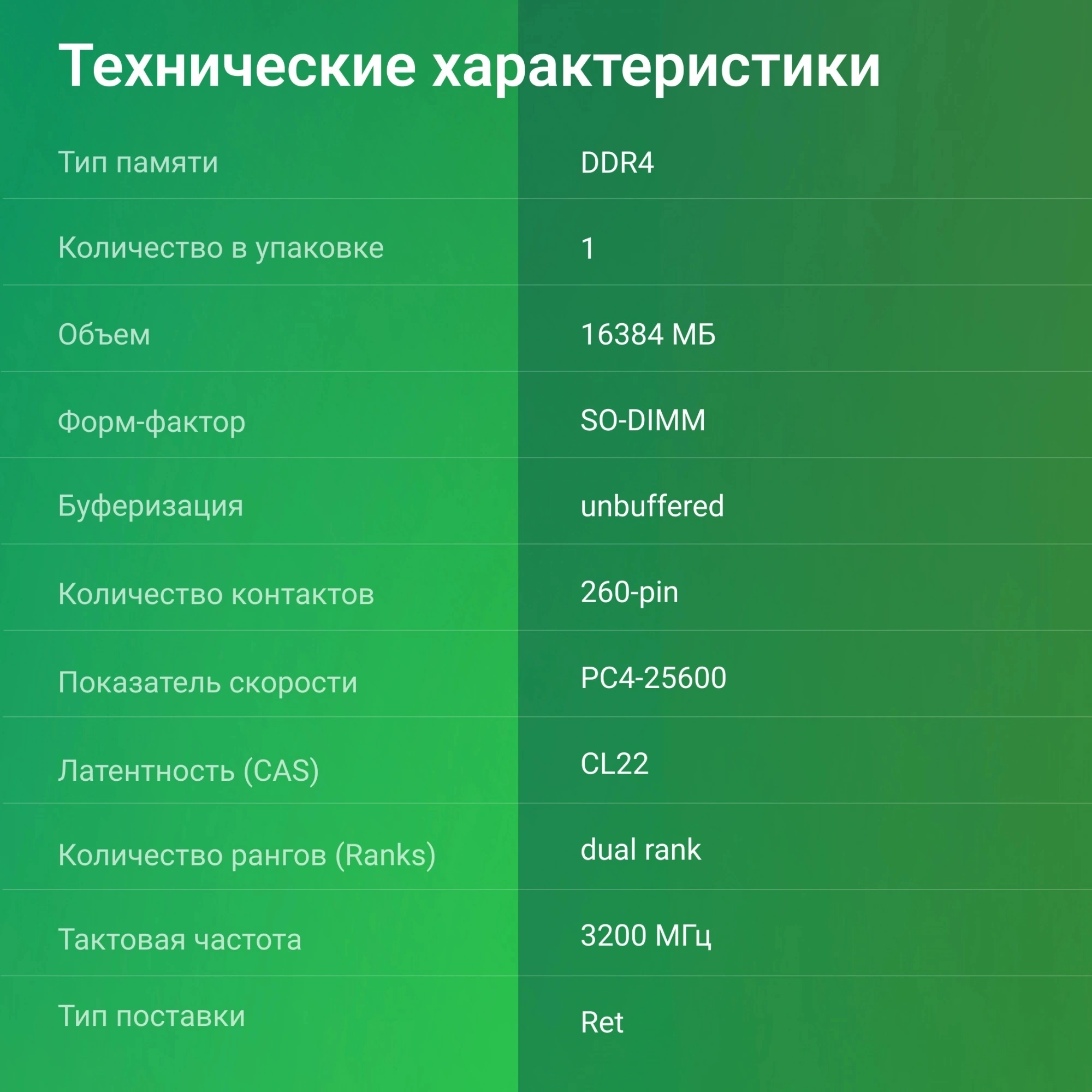 Тип памяти DDR4 обеспечивает баланс между производительностью и экономией энергопотребления, а форм-фактор SO-DIMM делает этот модуль идеальным выбором для ноутбуков и других устройств с ограниченным пространством. Показатель скорости PC4-25600 отражает высокую пропускную способность, что особенно актуально для ресурсоемких задач.