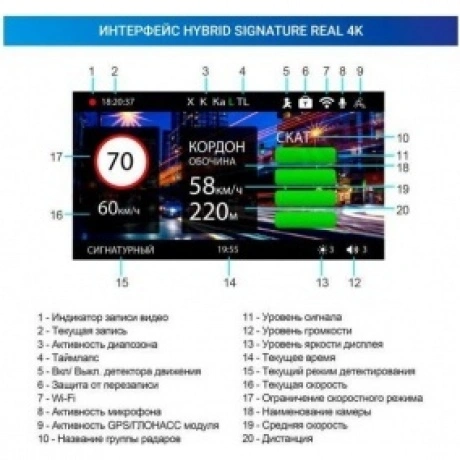 TrendVision Hybrid Signature Real 4K 2CH модель 2022 года с реальным разрешением 4К Ultra HD (3840x2160px) ! Инновационное комбо-устройство 3 в 1: видеорегистратор с камерой на матрице Sony (4K Ultra HD), сигнатурный радар-детектор (без ложных срабатываний), GPS-информатор с функцией SpeedCam, имеющий самые актуальные и полные базы камер/радаров. Всё это на сенсорном IPS дисплее 3, с возможностью управления, настройки и просмотра видеороликов как на экране устройства, так и на смартфоне -через мобильное приложение за счёт встроенного Wi-Fi модуля. Премиальная комплектация, помимо прочего, включает в себя заднюю Full HD камеру, антибликовый CPL-фильтр и 2 вида крепления (присоска и 3М-скотч).