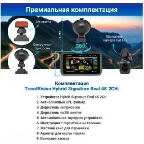 устройство Hybrid Signature Real 4K 2CH, антибликовый CPL-фильтр, держатель на присоске, держатель на 3м скотче, автомобильное зарядное устройство, инструкция с гарантийным талоном, жёсткий кейс для переноски, адаптер для карты памяти, задняя Full HD камера, упаковка