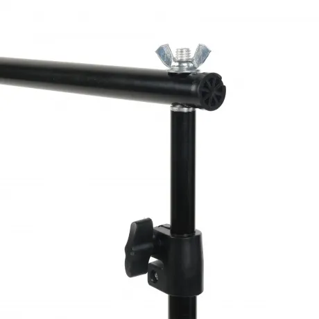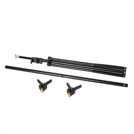 Держатель фона CS-02 предназначен для крепления фонов шириной до 80 см на высоту от 72 до 190 см. от пола. Держатель фона это простой и надежный способ закрепить студийный фон в любом месте съемки: в офисах, магазинах, апартаментах, на плэнере. Эта система будет востребована фотографами, видеографами, блогерами, которым требуется быстро создать съемочную площадку например, для записи интервью, мастер-класса, предметной съемки, съемки поясных или ростовых портретов и т.д. Система состоит из алюминиевой стойки-треноги, перекладины и двух клипс. Компактная конструкция весом 950 грамм легко переставляется, а регулируемая рабочая высота делает держатель универсальным, позволяя снимать как небольшие предметы, так и более крупные объекты. Трёхсекционные стойки изготовлены из алюминиевых трубок диаметром 22 / 19 / 16 мм, ножки из трубок диаметром 16 мм. Верхняя секция заканчивается винтом с резьбой М10, на который накручена гайка-барашек. Винт предназначен для установки и фиксации горизонтальной перекладины. Алюминиевая перекладина диаметром 22 мм и длиной 82 см с тремя установочными отверстиями крепится на стойку в двух положениях: по центру или консольно. Подвешивание фона производится при помощи 2 клипс-зажимов из прочного ABS-пластика (входят в комплект). Ширина захвата клипсы 60 мм. Клипсы могут использоваться для крепления тканевых, бумажных, пластиковых фотофонов или отражателей.