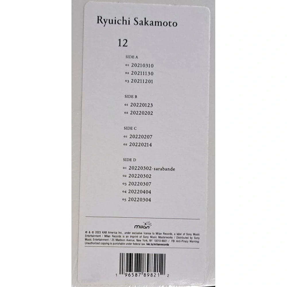 «12» знаменует собой 15-й сольный студийный альбом Сакамото и первый новый сольный материал с момента выхода async 2017 года. В альбом вошли 12 песен, выбранных из коллекции музыкальных зарисовок, которые Сакамото записал как звуковой дневник между 2021 и 2022 годами во время его продолжающейся борьбы с раком. Каждый трек назван и упорядочен по дате написания, кульминацией которого является сборник музыки, дающий интимный снимок этого периода жизни Сакамото.