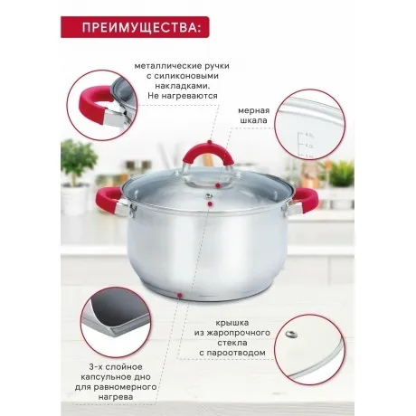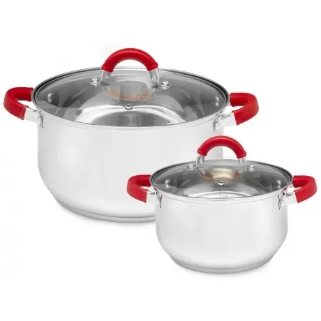 Набор кастрюль 4 предмета DELICE состоит из кастрюль с крышками объемом 3.3 и 5.8 л. Все предметы из набора изготовлены из нержавеющей стали с высокими антикоррозийными свойствами. Капсульное дно обеспечивает равномерное распределение тепла и быстрый нагрев содержимого, избегая пригорания пищи. Силиконовые ручки красного цвета не скользят и не нагреваются в процессе приготовления пищи. Вы легко сможете перемещать кастрюлю с горячим блюдом без использования прихваток. Крышки из жаропрочного стекла с отверстием для отведения пара выдерживают резкий перепад температур и обладают высокой термоустойчивостью. Кастрюли имеют внутреннюю шкалу определения объема жидкости, что ускоряет процесс приготовления пищи. Посуда серииDELICE подходит для использования на любых типах плит, включая индукционные. Можно мыть в посудомоечной машине.