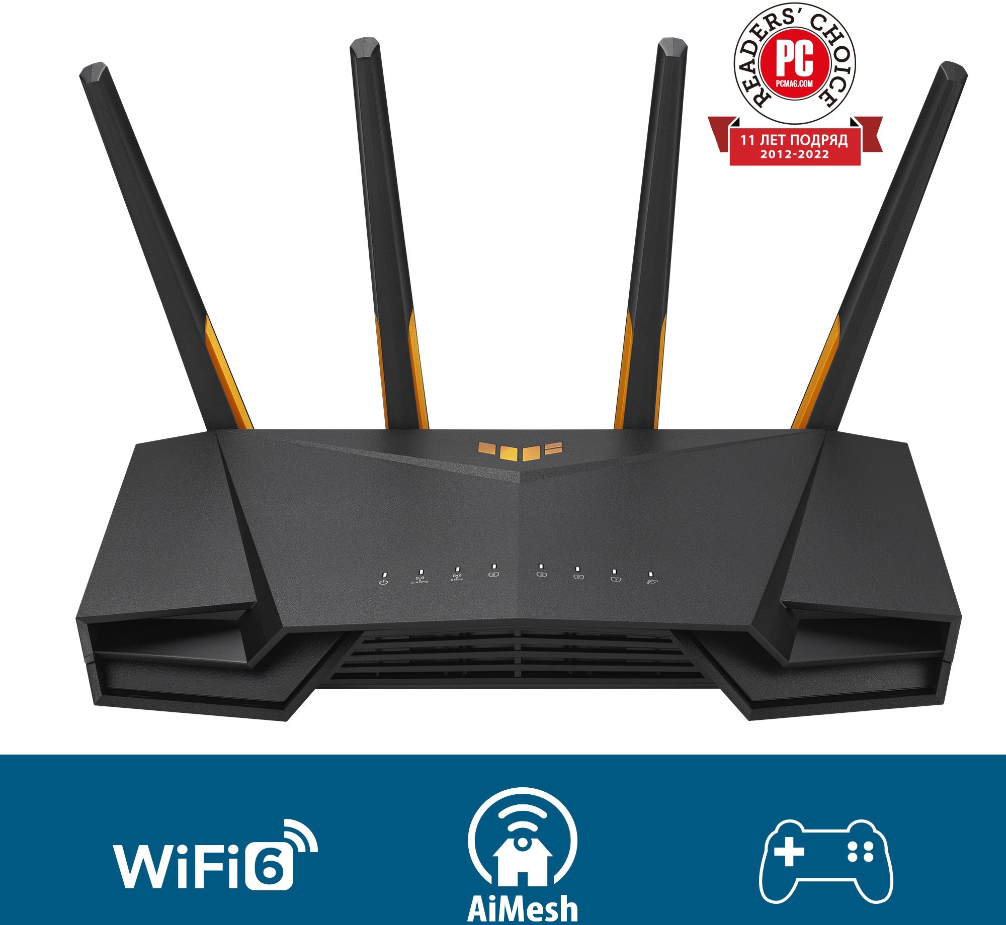 Wi-Fi роутер ASUS TUF Gaming AX4200 с модулем стандарта Wi-Fi 6 обеспечивает пропускную способность до 4200 Мбит/с и оснащен проводным разъемом LAN 2.5 Гбит/с для стабильного доступа к Интернету в онлайн-играх. Технологии OFDMA и MU-MIMO гарантируют высокую производительность при одновременном подключении компьютера, планшета, смартфона и других устройств. Четыре внешние антенны создают увеличенную зону покрытия сети Wi-Fi. Поддержка технологии AiMesh позволяет масштабировать сеть за счет объединения нескольких маршрутизаторов в одну систему. Алюминиевые панели и вентиляционные отверстия стабильно охлаждают внутренние компоненты роутера. В ASUS TUF Gaming AX4200 реализованы режимы работы под разные задачи – передача файлов, медиа стриминг, веб-серфинг, игры, общение. Система безопасности AiProtection Pro с функцией родительского контроля и протокол WPA защищают от онлайн-угроз.