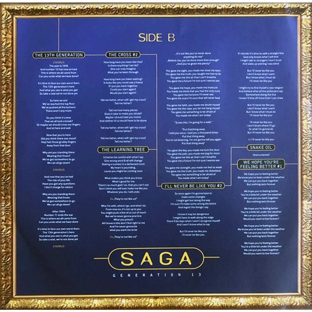Переиздание "Generation 13" - одиннадцатого студийного альбома Saga, выходившего в 1995 году. Это концептуальный альбом, написанный басистом Джимом Крайтоном и вдохновленный книгой 1993 года "13th Gen: Abort, Retry, Ignore, Fail?" американских авторов Нила Хоу и Уильяма Штрауса. В книге говорится, что люди, родившиеся между 1961 и 1981 годами, являются 13-м поколением Америки, причем поколение появляется каждые 20-25 лет после американской революции.