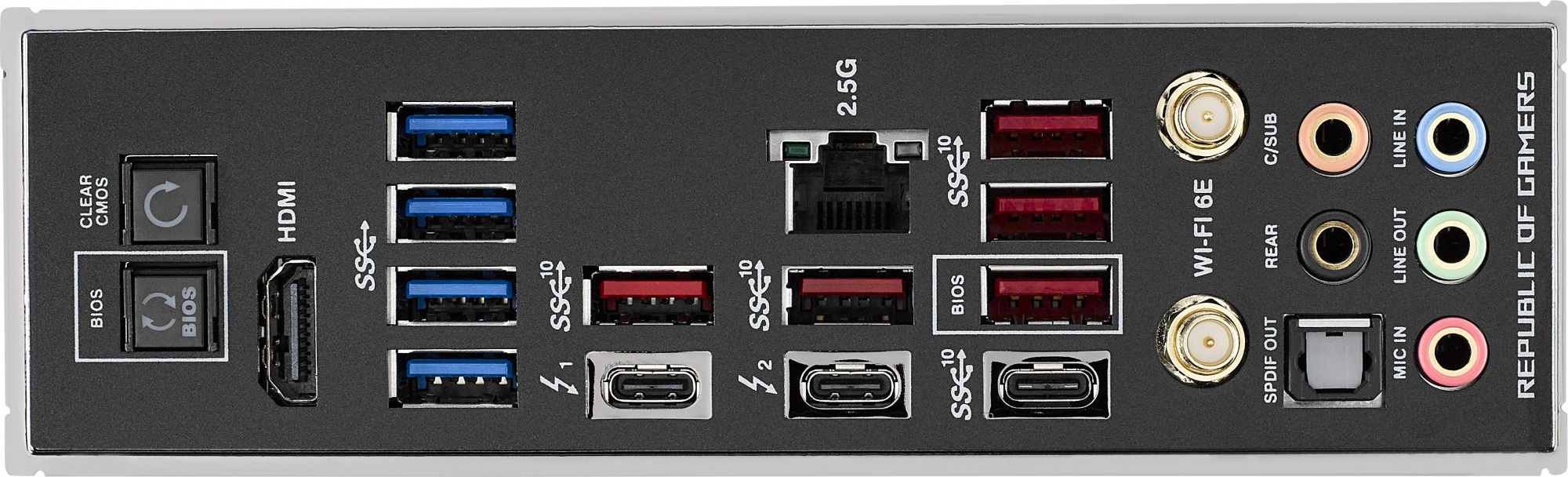HDMI, Thunderbolt 4 Type-C x 2, USB 3.2 Gen1 Type-A x 4, USB 3.2 Gen2 Type-A x 5, USB 3.2 Gen2 Type-C, выход S/PDIF оптический