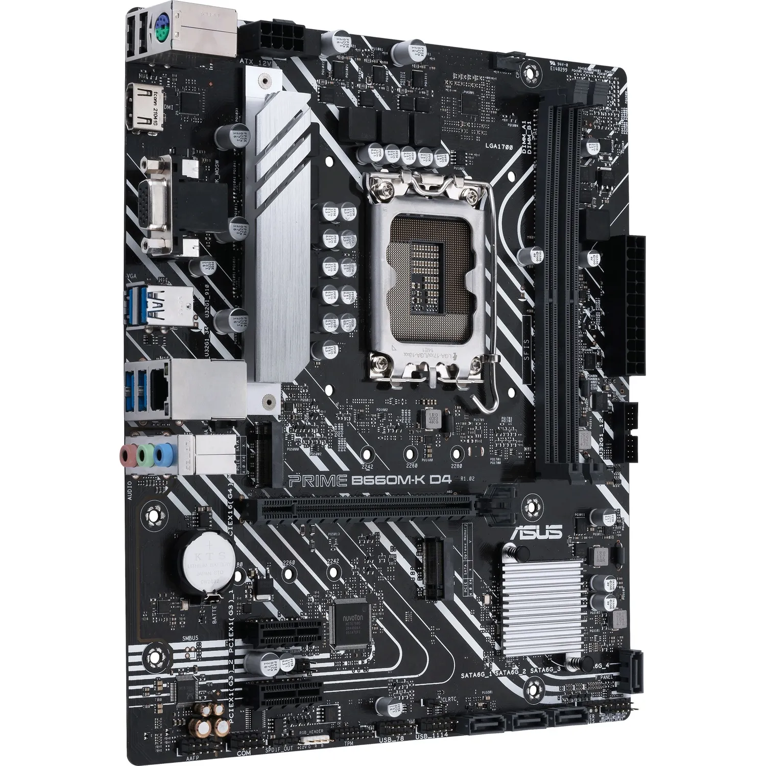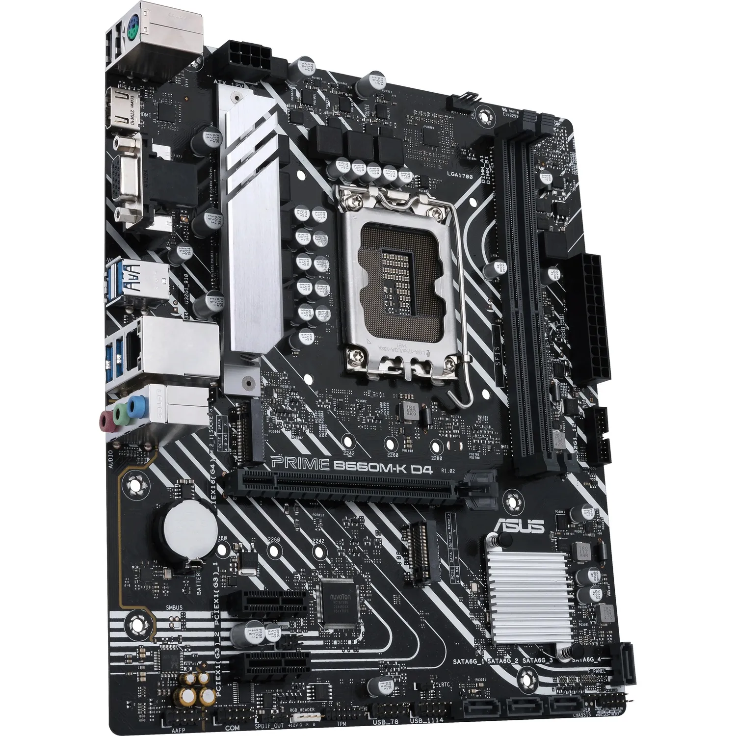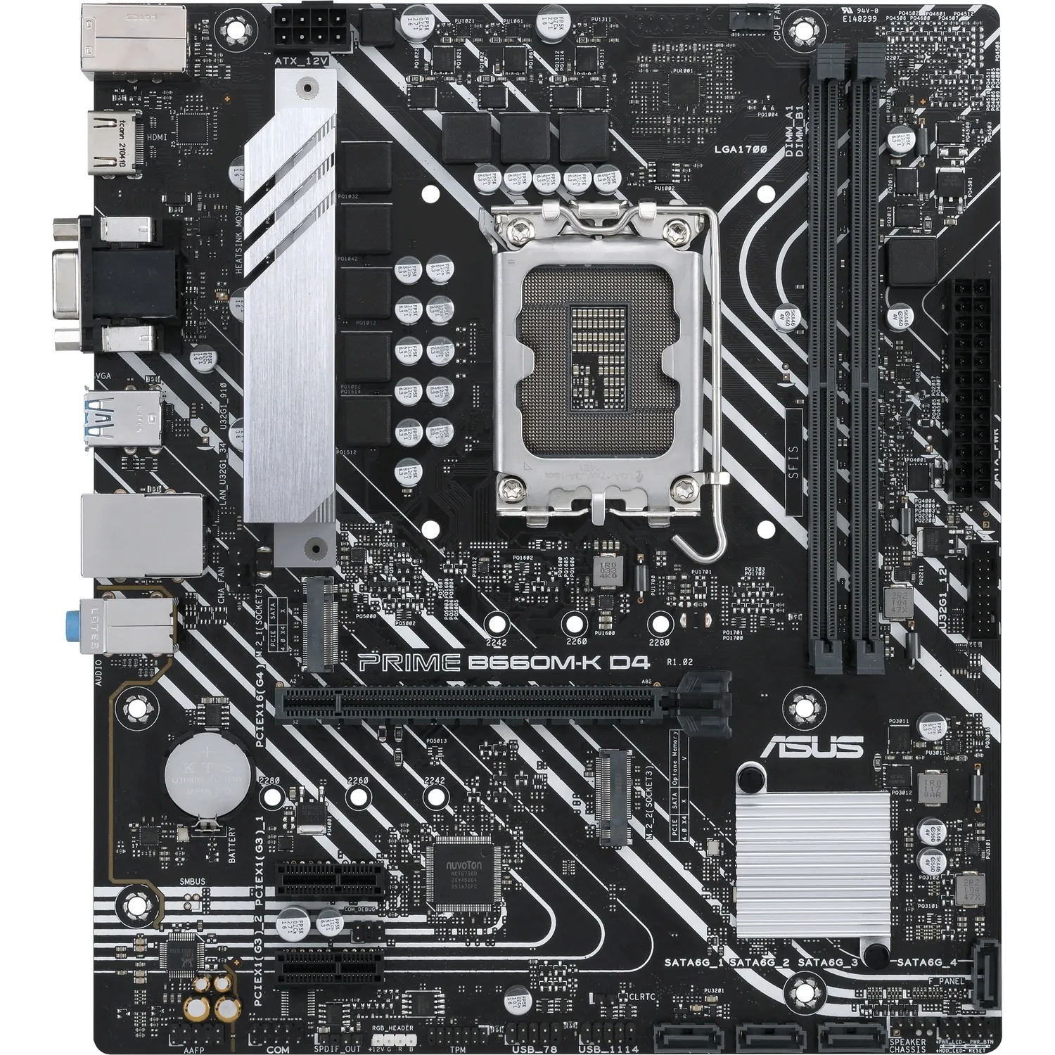 Материнская плата ASUS PRIME B660M-K D4 базируется на отличающемся безупречной стабильностью работы чипсете Intel B660. Модель совместима с процессорами Intel с ядрами Alder Lake и Raptor Lake. Плата рассчитана на сборку универсального компьютера для дома или офиса, демонстрирующего высокую производительность при решении любых типовых задач. Максимально допустимый объем оперативной памяти, равный 64 Гб, достаточен для удовлетворения потребностей подавляющего большинства пользователей. Плата располагает слотом PCI-E x16, который можно использовать для установки производительной видеокарты. Также в наличии 2 слота PCI-E x1. Оба разъема M.2 рассчитаны на монтаж твердотельных накопителей, поддерживающих интерфейс NVMe. Такие SSD демонстрируют скорости чтения и записи, существенно превышающие аналогичные показатели SSD SATA. Плата ASUS PRIME B660M-K D4 подходит для монтажа в миниатюрный корпус. Размеры устройства, соответствующего форм-фактору Micro-ATX, составляют 244x211 мм. Важной для некоторых пользователей особенностью платы является наличие коннектора COM-порта.