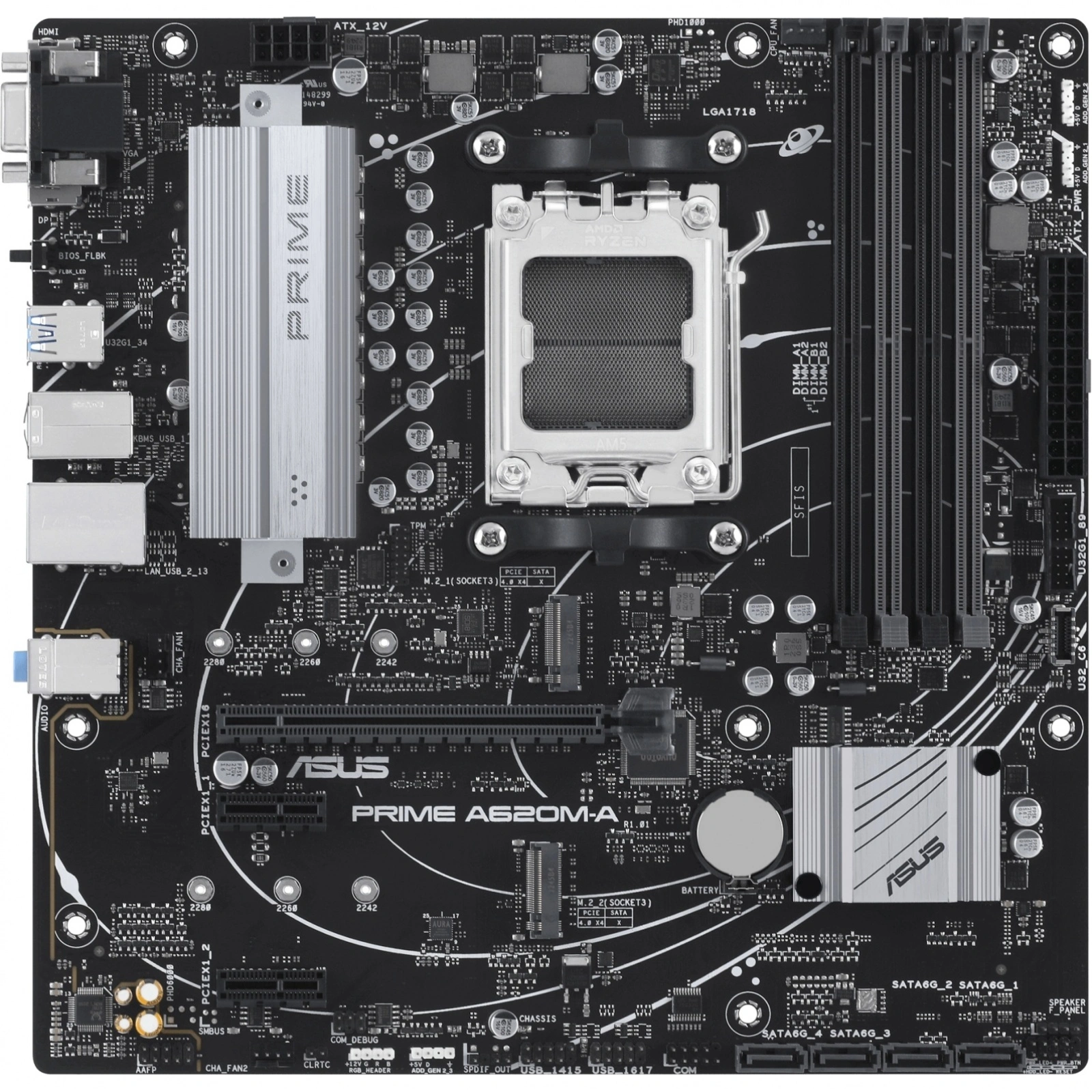 HDMI, VGA, DisplayPort, BIOS FlashBack button, 2xUSB 3.2 Gen 1 (Type-A), 1xPS/2, 4xUSB 2.0 (Type-A), Realtek 1Gb Ethernet, 3xAudio Jacks, Expansion Slots, 1xPCIe 4.0 x16 SafeSlot Core, 2xPCIe 3.0 x1, 1xAura RGB Header, 3xAddressable Gen 2 Headers, DDR5 support OptiMem II, AM5 Socket for AMD Ryzen 7000 Series Desktop Processors, 2xFront USB 3.2 Gen 1, 1xFront USB 3.2 Gen 1 Type-C, 2xM.2 2280 (PCIe 4.0 x4 mode), AMD A620 Chipset, 4xSATA 6Gb/s, 4xFront USB 2.0