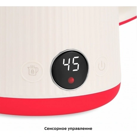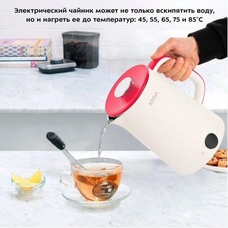 Электрический чайник с электронным терморегулятором Kitfort КТ-6197 может не только вскипятить воду, но и нагреть её до температур: 45, 55, 65, 75 и 85°С. Ручка чайника пластиковая, не нагревается и удобно лежит в руке. Ёмкость чайника 1.7 л. Кнопка «Вкл/Выкл» включает и выключает чайник. Кнопка «Поддержание температуры» циклически переключает температуру для поддержания 45, 55, 65, 75, 85 °С. На дисплее отображается текущая температура воды в чайнике. Корпус чайника и крышка выполнены из пластика, а внутренняя колба чайника и внутренняя часть крышки изготовлены из нержавеющей стали. Съёмная крышка и большое горлышко чайника облегчают доступ внутрь при его мойке и во время удаления накипи. Полный чайник закипает за 6–7 минут. При закипании чайник автоматически отключится. Прибор имеет защиту от перегрева и от включения без воды: при включении без воды чайник нагревается и отключается (срабатывает защита от перегрева). Подставка с центральным контактом дает возможность располагать на ней чайник в любом положении, обеспечивая вращение на 360°. Снизу имеется отсек для хранения шнура, в который можно смотать излишки шнура электропитания, чтобы он не мешал на столе. Для увеличения срока службы чайника своевременно удаляйте накипь. Поместите в чайник специальное средство, залейте 0.5 л воды и доведите до кипения. После вскипятите в нем воду и слейте её. Для предотвращения накипи используйте фильтрованную воду.