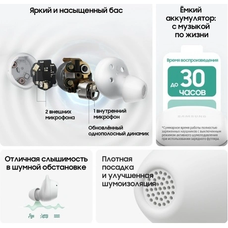 Galaxy Buds FE сочетает элегантный дизайн и отличную эргономику, благодаря которой с этими наушниками не захочется расставаться. В комплекте идёт коллекция амбушюр, среди которых каждый сможет найти свой размер. Мощная система активного шумоподавления эффективно устраняет все нежелательные звуки, позволяя оставаться наедине с музыкой. Удерживая палец на сенсорной области, можно управлять активным шумоподавлением или переключиться в режим звукового фона, позволяющий общаться с другим человеком, не вынимая наушников. Наслаждайтесь музыкой и общением столько, сколько захочется, благодаря впечатляющей автономности, достигающей 30 часов от одного заряда. Три разнонаправленных микрофона точно фиксируют ваш голос, отделяя его от фонового шума. Также поддерживается технология коррекция направленности речевого микрофона, позволяющая Galaxy Buds FE подстраиваться под особенности каждого конкретного голоса. Если вы забудете наушники, они быстро дадут о себе знать с помощью специального сигнала, чтобы вам не пришлось возвращаться издалека. Даже если Galaxy Buds FE потеряются, их последнее местоположение можно легко отследить по карте.