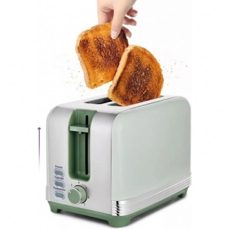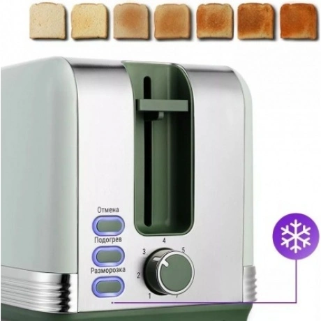 Стильный тостер КТ-6070, выполненный в приятных зелёных тонах - это незаменимая вещь для любителей ароматного и хрустящего поджаренного хлеба для приготовления горячих бутербродов, сэндвичей, бейглов, хлебцев для закусок, салатов и других блюд. 7 степеней обжаривания позволяют получить именно тот хруст и румяность хлеба, который любите именно вы! Режим разморозки позволяет приготовить тосты из замороженного хлеба. Подогрев служит для подогрева уже готовых тостов, если они остыли. Загруженные тосты автоматически центрируются, чтобы их обжарка с 2 сторон была равномерной. Благодаря широким слотам можно обжаривать толстые куски хлеба, половинки круассанов, бейглов и другие хлебобулочные изделия. По окончании приготовления тостер автоматически отключается, а тосты поднимаются вверх, чтобы их было удобнее извлечь. Механизм экстра-подъёма позволяет приподнять тосты ещё выше, если они небольшого размера. В нижней части корпуса тостера расположен съёмный поддон для сбора крошек. Просто выдвиньте его и выбросите скопившиеся крошки, а остатки соберите салфеткой. На дне корпуса тостера имеется отсек для хранения шнура, в который можно смотать излишки шнура электропитания, чтобы он не мешал на столе.