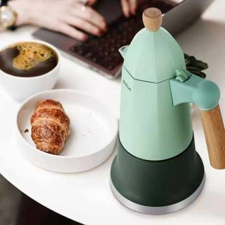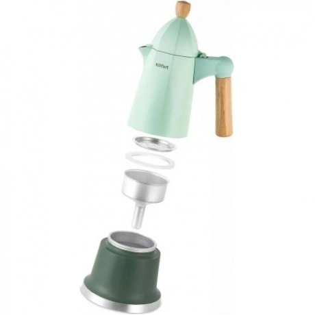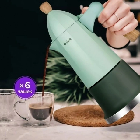 Гейзерная кофеварка КТ-7154 поможет приготовить вам ароматный чёрный кофе. Она компактная и простая в использовании. Кофеварка идеально подойдёт для приготовления кофе в домашних условиях или на даче. В резервуар наливают воду и устанавливают воронку с фильтром, куда добавляют молотый кофе. Сверху накручивается резервуар для кофе. Далее кофеварку помещают на плиту. Вода нагревается, пар вытесняет горячую воду через фильтр и получается готовый кофе!. С гейзерной кофеваркой нет необходимости следить за поднятием пенки, а получаемый кофе не содержит гущи. КТ-7154 рассчитана на приготовление 6 чашек кофе по 40 мл. В воронку с фильтром помещается 25 г. кофе, а резервуар для воды составляет 350 мл. Гейзерная кофеварка КТ-7154 подходит для использования на газовых, электрических и инфракрасных плитах. Рекомендуется включать плиту на среднюю мощность при заваривании кофе. Дождитесь, когда кофеварка остынет, и разберите её на составные части. Для этого открутите резервуар для кофе от резервуара для воды. Вытащите воронку с фильтром и вытряхните кофейный жмых. Промывайте все детали тёплой проточной водой. Кофеварка порадует вас не только свежеприготовленным ароматным кофе, но и своим креативным дизайном! Эргономичная деревянная ручка не скользит в руке и позволяет брать устройство, не рискуя обжечься.