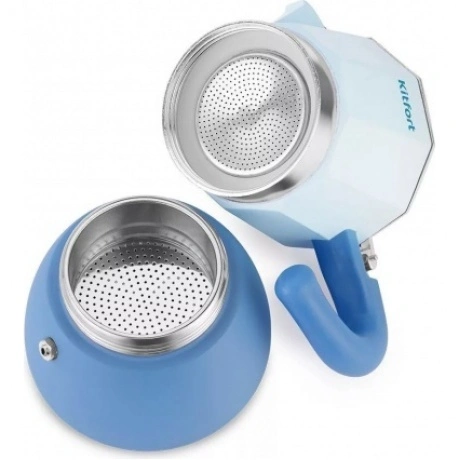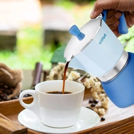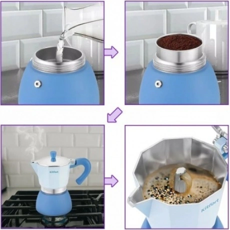 Гейзерная кофеварка поможет приготовить чёрный кофе. Преимущество такой кофеварки в простоте приготовления кофе. В сравнении с туркой, при приготовлении кофе в гейзерной кофеварке нет необходимости следить за поднятием пенки, а кофе не содержит гущи. В резервуар наливают воду и устанавливают воронку с фильтром, куда добавляют молотый кофе. Сверху накручивается резервуар для кофе. Далее кофеварку помещают на плиту. Вода нагревается, пар вытесняет горячую воду через фильтр, и получается вкусный кофе!. В воронку с фильтром кофеварки КТ-7151 помещается около 34 грамм кофе, а ёмкость резервуара для воды – 340 мл. Она рассчитана на приготовление 6 чашек по 40 мл. В комплекте к кофеварке идут воронка с фильтром, куда непосредственно добавляется молотый кофе, и фильтр резервуара для кофе, который предотвращает попадание гущи в напиток. Гейзерная кофеварка КТ-7151 подходит для использования на газовых, индукционных, электрических и инфракрасных плитах. Рекомендуется включать плиту на среднюю мощность при заваривании кофе. Разберите кофеварку на составные части. Для этого открутите резервуар для кофе от резервуара для воды. Вытащите воронку с фильтром и вытряхните кофейный жмых. Промывайте все детали тёплой проточной водой. Гейзерная кофеварка КТ-7151 приготовит кофе всего за несколько минут. Кофеварка компактная и простая в использовании. Она идеально подойдёт для приготовления кофе в домашних условиях или на даче, а стильный дизайн будет радовать вас каждое утро!