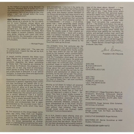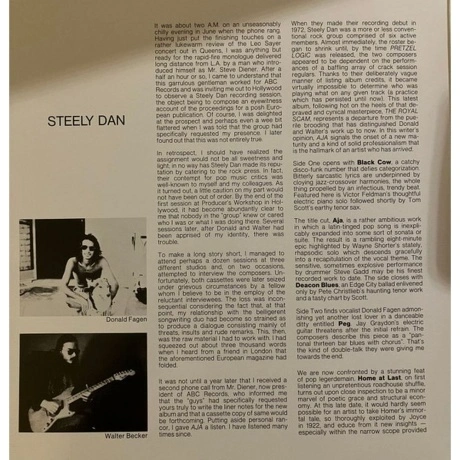 "Aja" - Шестой студийный альбом американской джаз-рок-группы Steely Dan, вышедший 23 сентября 1977 года. Диск достиг 3-го места в США и 5-го в Великобритании и получил 23 февраля 1978 года премию Грэмми в категории Best Non-Classical Engineered Recording. В 2003 году журнал "Rolling Stone" включил этот альбом под № 145 в список «500 величайших альбомов всех времён по версии журнала "Rolling Stone". Альбом получил положительные отзывы музыкальных изданий и критиков, включая Allmusic, Robert Christgau, BBC Music, Rolling Stone. Ремастированное переиздание на черном виниле в разворотном конверте. Steely Dan - арок-группа, исполняющая сложный, нестандартный джаз-фьюжн с элементами софт-рока, фанка, ритм-энд-блюза. Составлявшие основу коллектива Уолтер Беккер и Дональд Фейген предпочитали студийную работу и редко выступали с концертами; в своих умных и необычных текстах они нередко касались "тёмных"сторон жизни (наркотики, криминал и т. д.). Steely Dan имели стабильный успех в 1970-х годах, но впоследствии получили от журнала Rolling Stone определение "идеальные антигерои в музыке 70-х". Группа распалась в 1981 году, но реформировалась двенадцать лет спустя и возобновила концертную и студийную деятельность.