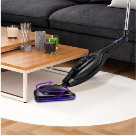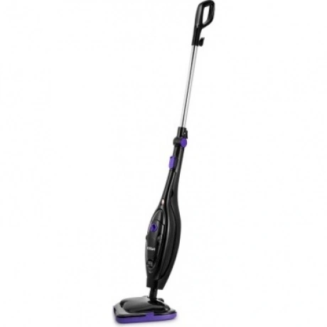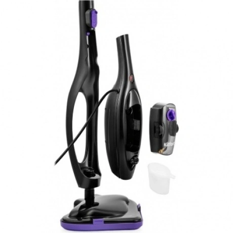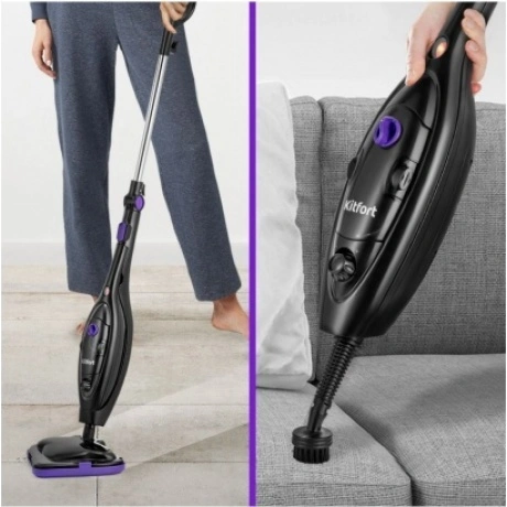 Паровая швабра КТ-1061 — универсальное устройство, которое поможет избавиться от пыли и грязи с помощью мощной струи пара, а также продезинфицирует обрабатываемую поверхность. Устройство оснащено съемным резервуаром для воды емкостью 300 мл, что позволяет производить непрерывную уборку до 20 минут в зависимости от интенсивности подачи пара. Конструкция «2 в 1» предусматривает наличие ручного модуля, который удобно использовать с насадками. С помощью насадок можно очистить большинство вещей в доме: легко отмыть окна, почистить шторы и мягкую мебель. Плоская и круглые нейлоновые щетки эффективно очищают сложные загрязнения с помощью механического воздействия. Для очистки окон, зеркал и кафельной плитки предусмотрена специальная насадка для отпаривания с резиновым скребком. Ее можно использовать с тряпкой для отпаривания, чтобы отпаривать одежду и чистить обивку мягкой мебели. Регулятор подачи пара позволяет плавно настраивать интенсивность выходящего пара. Это очень удобно при очистке разных типов поверхностей с разным уровнем загрязнения. Чем сильнее загрязнение, тем больше пара потребуется. Паровая швабра обладает функцией вертикальной парковки и большим углом наклона при уборке, а также удлинительную ручку можно сложить, чтобы легко убирать пространство под мебелью. Напольная щетка закреплена на специальном шаровом шарнире с наклоном в двух плоскостях, что делает швабру очень маневренной и облегчает процесс уборки. На корпусе предусмотрены держатели для шнура.