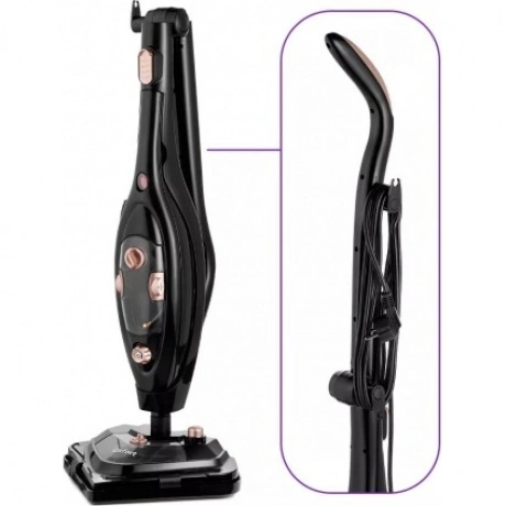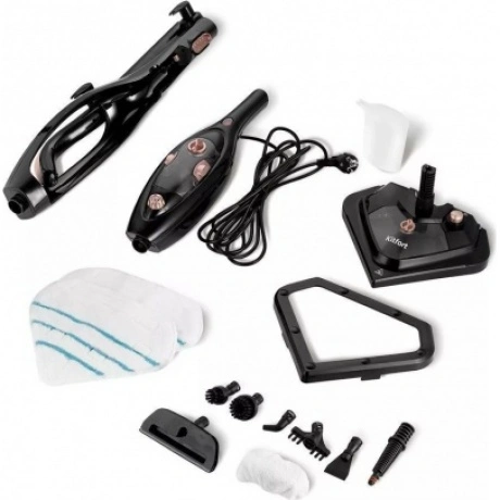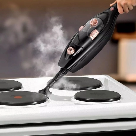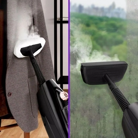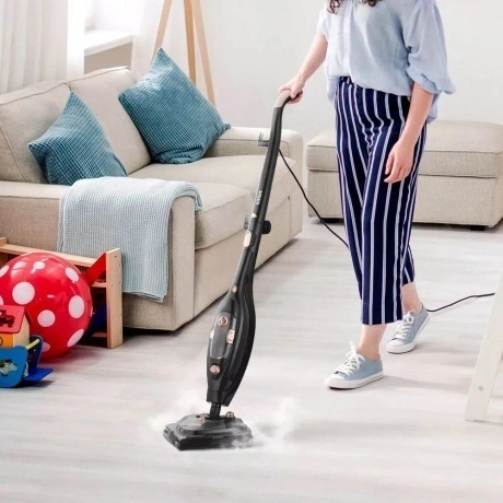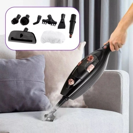 Паровая швабра КТ-1058 — универсальное устройство, которое поможет избавиться от пыли и грязи с помощью мощной струи пара, а также продезинфицирует обрабатываемую поверхность. Паровая швабра очистит раковину и плиту на кухне, зеркала и мебель без каких-либо химических средств, исключительно паром. Устройство оснащено съемным резервуаром для воды емкостью 300 мл, что позволяет производить непрерывную уборку до 20 минут в зависимости от интенсивности подачи пара. Принцип действия паровой швабры основан на воздействии горячего пара на загрязнения. Пар проникает внутрь загрязнения, размягчая и растворяя его, а затем с помощью тряпки частички грязи смываются. Высокая температура пара способствует процессу очистки. Нерастворимое в воде загрязнение (например, жировое отложение) удаляется аналогичным образом: под действием высокой температуры пара оно размягчается, а пар вместе с механическим воздействием на загрязнение превращает его в эмульсию, состоящую из мелких частичек загрязнения и воды. Эта эмульсия затем может быть легко удалена тряпкой. Во время работы паровой швабры вода из резервуара подается в бойлер помпой (водяным насосом). Для паровой швабры не нужны чистящие средства, поэтому она станет идеальным решением уборки дома для аллергиков. Однако с помощью паровой швабры КТ-1058 можно проводить очистку пола и с моющим средством, для этого устройство оснащено резервуаром для моющего средства. В комплекте есть рамка для ковра, которая обеспечивает легкое скольжение щетки для пола по ковру. Конструкция «2 в 1» предусматривает наличие ручного модуля, который удобно использовать с насадками. С помощью насадок можно очистить большинство вещей в доме: легко отмыть окна, почистить шторы и мягкую мебель. Плоская и круглые нейлоновые щетки эффективно очищают сложные загрязнения с помощью механического воздействия. Для очистки окон, зеркал и кафельной плитки предусмотрена специальная насадка для отпаривания с резиновым скребком. Ее можно использовать с тряпкой для отпаривания, чтобы отпаривать одежду и чистить обивку мягкой мебели. Регулятор подачи пара позволяет плавно настраивать интенсивность выходящего пара. Это очень удобно при очистке разных типов поверхностей с разным уровнем загрязнения. Чем сильнее загрязнение, тем больше пара потребуется. Паровая швабра обладает функцией вертикальной парковки и большим углом наклона при уборке, который поможет легко убирать пространство под мебелью. Напольная щетка закреплена на специальном шаровом шарнире с наклоном в двух плоскостях, что делает швабру очень маневренной и облегчает процесс уборки. На корпусе предусмотрены держатели для шнура. Ручка корпуса складная, благодаря чему швабра занимает меньше места при хранении. Паровая швабра КТ-1058 очень легкая и простая в использовании. Уборка с ней будет проходить быстро и легко.