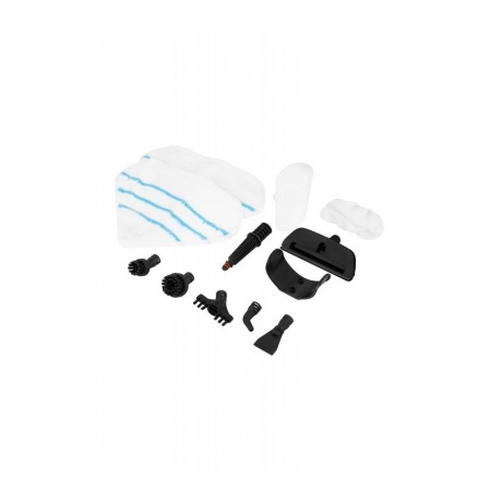 верхняя удлинительная трубка с двумя уплотнительными кольцами на паро- вом сопле, нижняя удлинительная трубка с двумя уплотнительными кольцами на паро- вом сопле , напольная щетка, крышка резервуара для моющего средства с уплотнительным кольцом , тряпка для пола 2 шт., рамка для ковра, насадка для отпаривания с резиновым скребком , тряпка для отпаривания , плоская нейлоновая щетка, малая круглая нейлоновая щетка , большая круглая нейлоновая щетка , скребок , угловая насадка, струйная насадка с д