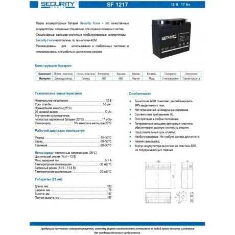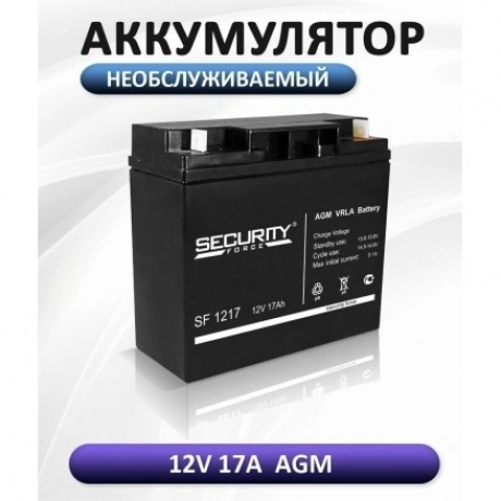Security Force SF 1217 — необслуживаемый свинцово-кислотный аккумулятор напряжением 12В и емкостью 17Ач. Торговый бренд Security Force объединяет модели АКБ, оптимизированные для энергообеспечения охранных и пожарных сигнализаций. SF 1217 купить также можно для обеспечения резервного и автономного питания осветительных и измерительных приборов, кассовых аппаратов, систем видеонаблюдения и контроля.
