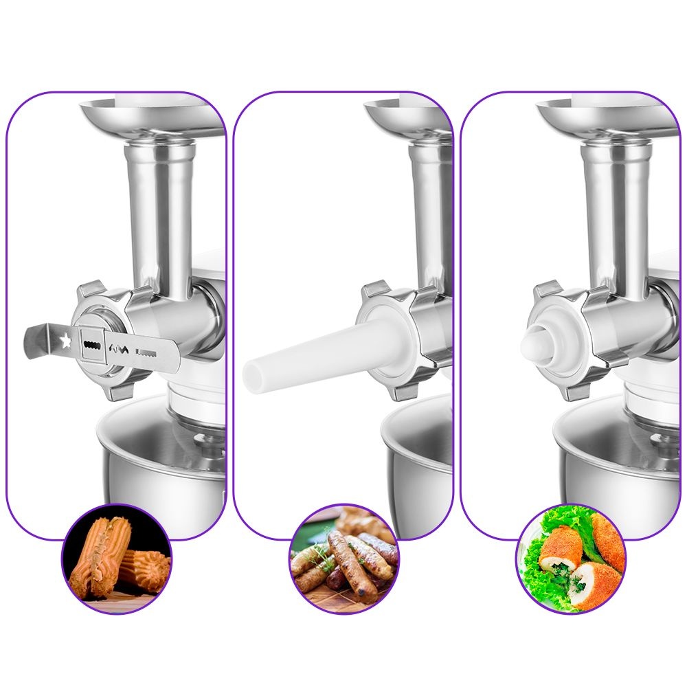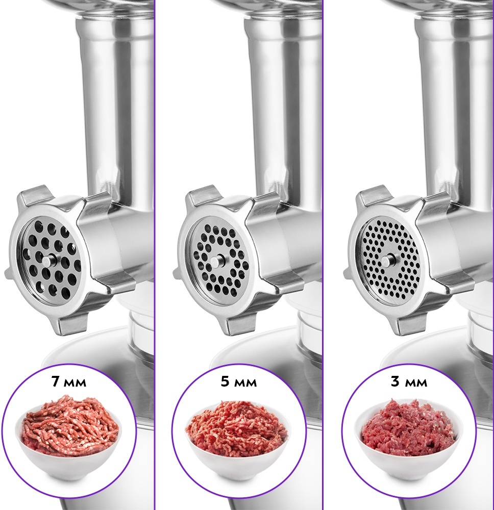 Цельнометаллический планетарный миксер КТ-3423 поможет вам смешать ингредиенты, взбить яичный белок или сливки, приготовить картофельное пюре, соус, крем, мусс, замесить жидкое тесто для блинов и крутое для пельменей и пирогов. С помощью регулятора можно установить скорость от 1 до 8. Для начала работы выберете скорость, поворачивая регулятор по часовой или против часовой стрелки. Кнопкой «Вкл/Выкл» можно остановить или продолжить работу. Индикатор скорости появится на дисплее. Чаша ёмкостью 4,3 л изготовлена из нержавеющей стали, в ней можно смешивать даже горячие ингредиенты. Во время работы насадка вращается вокруг своей оси и одновременно движется по окружности по внутреннему объёму чаши, обеспечивая идеальное смешивание. В комплекте идут венчики для взбивания яичных белков, сливок, для приготовления жидкого теста, крюк для замеса тугого теста для пельменей и пирогов, насадки для смешивания и приготовления пюре, кондитерских смесей, томатной пасты и многого другого. В металлической чаше можно смешивать даже горячие ингредиенты. Съёмная крышка предотвращает разбрызгивание ингредиентов при взбивании. Через загрузочное отверстие можно добавлять ингредиенты прямо во время работы миксера. В комплекте с миксером идёт насадка-мясорубка с широким загрузочным лотком с производительностью 1 кг фарша в минуту. Решётки различного диаметра и позволят сделать как котлеты и бифштексы, так и нежнейшие фрикадельки, например, для детского питания. Насадки для колбас и кеббе используются для приготовления колбасок. Фигурная насадка используется для приготовления различных изделий из теста. Блендер оснащён стеклянной чашей ёмкостью 1,5 л с мерной шкалой. Он с лёгкостью справится со смешиванием разных продуктов и колкой льда. В крышке блендера есть отверстие для добавления ингредиентов во время работы, оно закрывается колпачком. Благодаря овощерезке устройство поможет с тёркой и шинковкой овощей, фруктов и других пищевых продуктов в домашних условиях. В комплекте с овощерезкой идут 5 насадок. Они подходят для нарезки тонких и толстых ломтиков или соломки. Вместе с устройством в комплекте идёт широкий ассортимент различных насадок. Все комплектующие легко снимаются и очищаются.