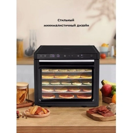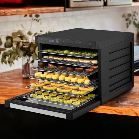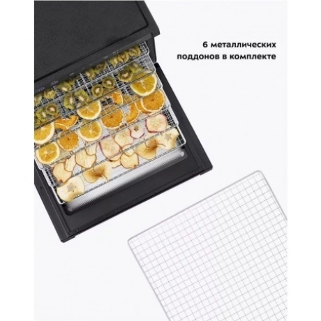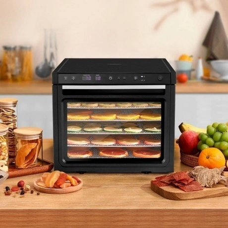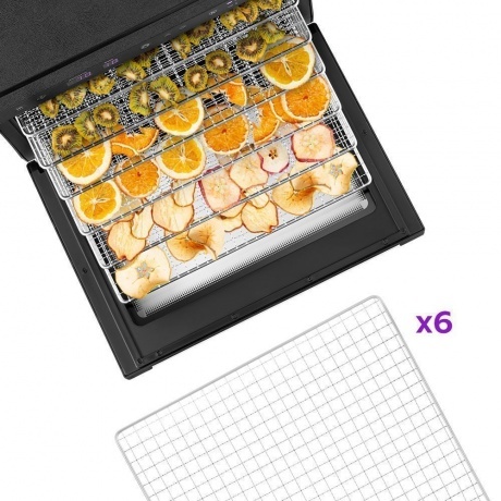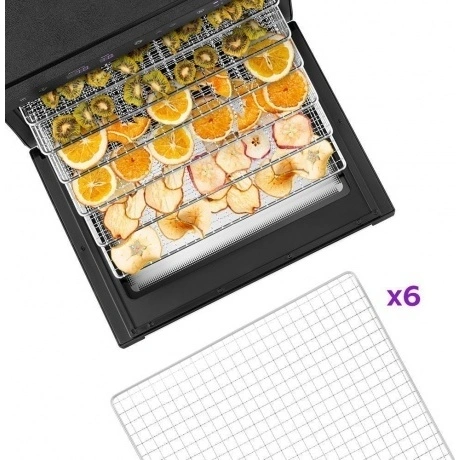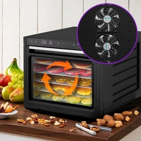 Электрическая сушилка предназначена для сушки овощей, фруктов, ягод, грибов, корнеплодов, трав, а также мяса и рыбы. Вместительная сушилка для овощей и фруктов КТ-1962 сохранит любимые фрукты и овощи полезными круглый год!. На сушилке можно устанавливать температуру сушки в диапазоне 35-70°C с шагом 5 градусов. Сушилка также оснащена таймером до 99 часов с шагом 1 час. У сушилки есть 3 предустановленных режима: поддержание тепла, быстрая и медленная сушка. В комплекте к сушилке идут 6 вместительных металлических поддонов размерами 38.5x33.6 см. На них, помимо овощей, фруктов, ягод, грибов и зелени, можно сушить мясо, рыбу и птицу. Продукты разного типа рекомендуется выкладывать на разные поддоны. В сушилке установлено два мощных нагревательных элемента и два вентилятора, обеспечивающих равномерное распределение нагретого воздуха по объему камеры. Благодаря горизонтальному обдуву смешение запахов при сушке одновременно разных продуктов минимально.