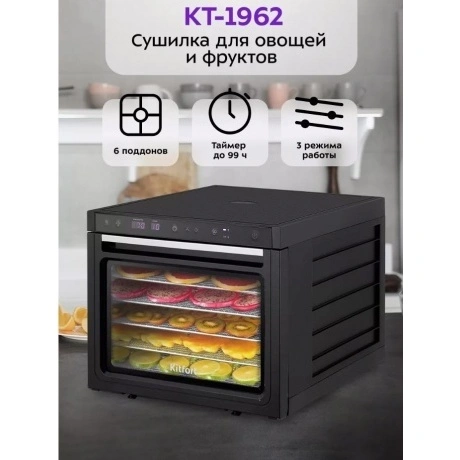 Сушилка для овощей и фруктов Kitfort КТ-1962 - стоимость товара 14017 руб. в интернет-магазине КотоФото. Характеристики, фото и описание доступны на карточке товара. Купить товар можно на сайте онлайн или заказать по телефону 8(812)426-98-99 в Санкт-Петербурге, а забрать в пункте самовывоза или оформить доставку на дом.