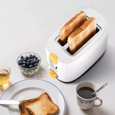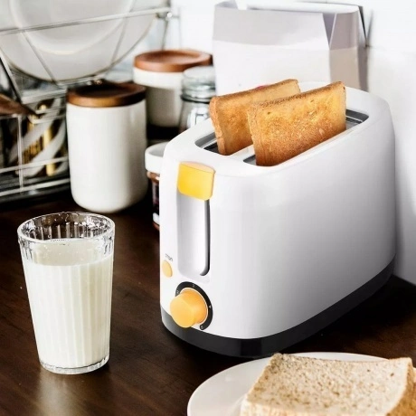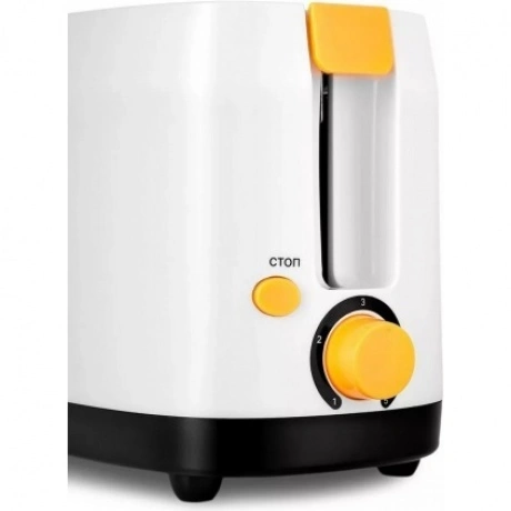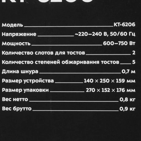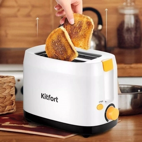 Тостер Kitfort КТ-6206 имеет поворотный регулятор на корпусе для выбора одной из пяти степеней обжаривания. Они отличаются друг от друга временем обжарки: чем дольше длится процесс приготовления тостов, тем сильнее они обжариваются. Чтобы прервать процесс готовки, можно воспользоваться кнопкой «Стоп». В два широких слота можно поместить кусочки хлеба толщиной не более 1.5-2 см. По окончании приготовления прибор отключается автоматически и поднимает тосты наверх для их удобного извлечения.