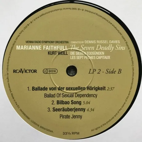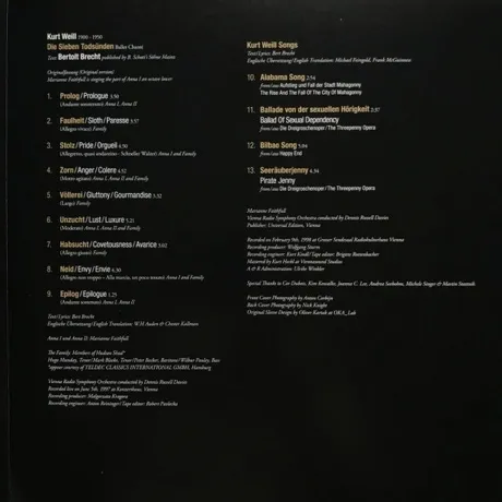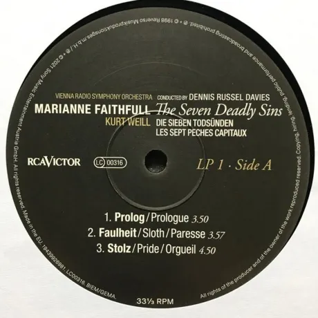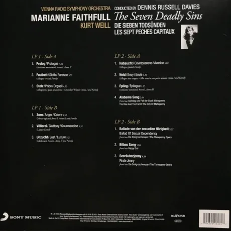 Легендарные альбомы 20th Century Blues и Seven Deadly Sins впервые на виниле!. Певице и актрисе в декабре 2021 года исполнится 75 лет!. В 1933 году два легендарных деятеля немецкого театра и музыкального ландшафта 20-го века, Курт Вайль, ответственный за музыку, и Бертольт Брехт, написавший тексты песен, в сотрудничестве с ведущим балетмейстером Джорджем Баланчином создали эту серию художественных песен как балет. «Семь смертных грехов» - студийная запись Марианны Фейтфулл одноименного сатирического балета Курта Вайля, с Симфоническим оркестром Венского радио под управлением Денниса Рассела Дэвиса. «Seaven deadly sins» был выпущен в 1998 году на компакт-диске - а теперь впервые будет доступен на двойном виниле, релиз в декабре 2021 года.