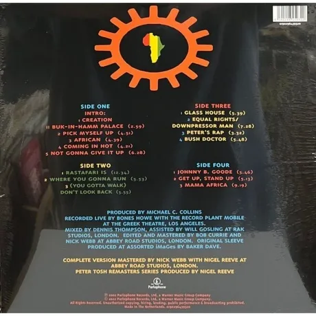 Intro / Creation / Buk-In-Hamm Palace (Live) <2002 Remaster>, Pick Myself Up (Live) <2002 Remaster>, African (Live) <2002 Remaster>, Coming in Hot (Live) <2002 Remaster>, Not Gonna Give It Up (Live) <2002 Remaster>, Rastafari Is (Live) <2002 Remaster>, Where You Gonna Run (Live) <2002 Remaster>, (You Gotta Walk) Don't Look Back, Glass House (Live), Equal Rights / Downpressor Man (Live), Peter's Rap (Live), Bush Doctor (Live) <2002 Remaster>, Johnny B. Goode (Live) <2002 Remaster>, Get Up, Stand