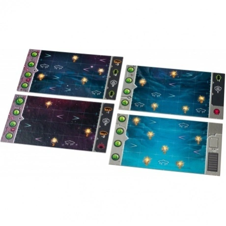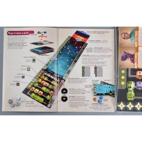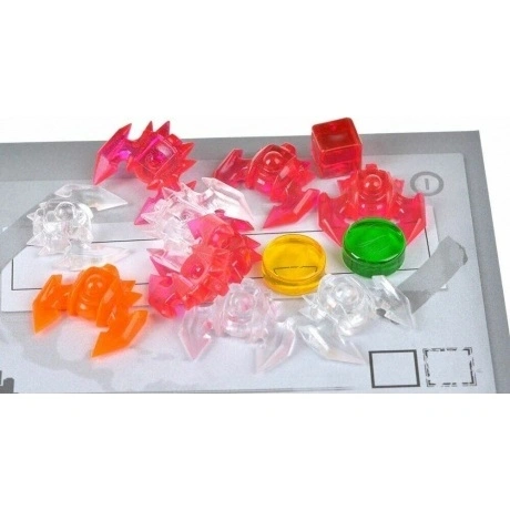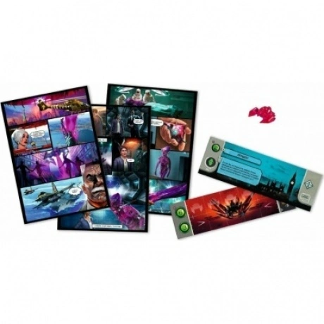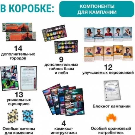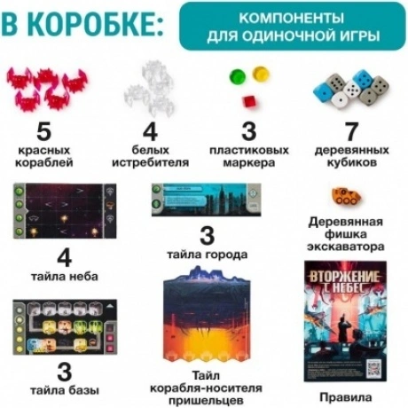 5 фиолетовых кораблей, 4 белых истребителя, 3 пластиковых маркера, 7 деревянных кубиков, деревянная фишка экскаватора, тайл корабля-носителя пришельцев, 4 тайла неба, 3 тайла базы, 3 тайла города, правила, Компоненты для кампании: блокнот кампании, 4 комикса-инструктажа, 14 дополнительных городов, 12 улучшаемых персонажей, 13 уникальных сценариев, 9 дополнительных тайлов базы и неба, особые жетоны для кампании, особый оранжевый истребитель