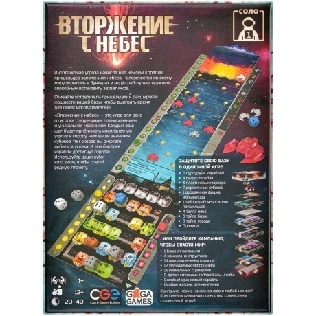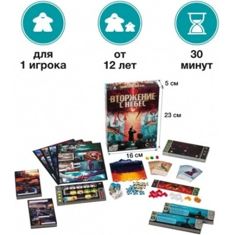 Вторжение с Небес – это фантастическая стратегия для одного игрока в духе апокалипсиса, в ходе которой человеческой расе предстоит столкнуться с инопланетными захватчиками, а вам – стать её последней надеждой. Хитрость и эгоизм пришельцев высоки, но и люди не намерены сдаваться без боя. Вашей главной задачей будет найти и сконструировать супер-оружие, которое склонит чашу весов в пользу человечества и раз и навсегда даст понять, что мы не потерпим на своей земле этих засланцев из космоса! Вы будете строить и активировать отсеки ваших подземных баз, сбивать на подлетах корабли инопланетян, пытающихся разрушить город, в котором вы обосновались, а также стараться закончить свои исследования прежде, чем город всё же падёт под залпами вражеских пси-орудий. Хоть эта игра и стала победителем в номинации Лучшая соло-игра 2022 года, но внутри сюжетной кампании вы будете далеко не одни – вашими помощниками с радостью станут отряды авиации, зачищающие небо над городом, научные отсеки базы, от исследований и результатов которых будет зависеть будущее целой расы, батареи ПВО, которые будут прикрывать ваши спины столько, сколько смогут, и многое другое. Компонентов в игре много – ведь вас ждут как классический режим, так и приключенческие сценарии, а уровень сложности вы легко сможете подстроить под себя. Ну что, готовы сразиться за будущее нашего мираx