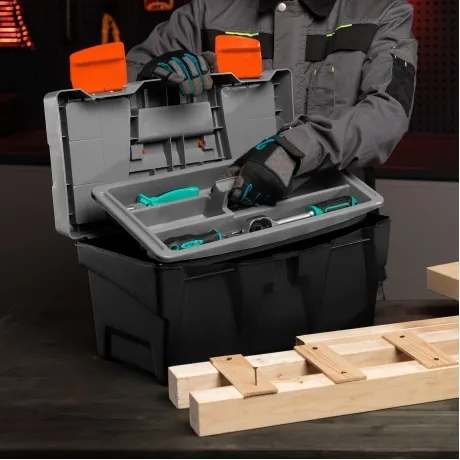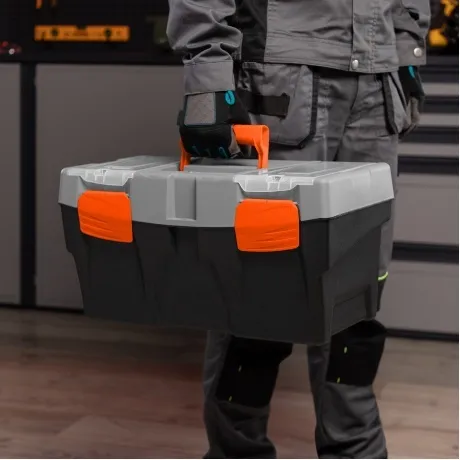 Кейс для инструмента Stels 90705 дает возможность переносить к месту проведения строительных, отделочных, ремонтных работ ручной и механизированный инструмент, а также крепеж, фурнитуру, расходники, любые рабочие принадлежности. Длина черно-серого инструментального бокса, материалом для изготовления которого послужил полипропилен, составляет 500 мм (20 дюймов) при высоте и ширине 260 мм. Под крышкой изделия расположен съемный поддон, отлично подходящий для хранения мелкого крепежа, оснастки и малогабаритных деталей, аксессуаров. Отличаясь большой вместимостью основного отсека, инструментальный ящик Stels 90705 имеет удобную пластиковую складную ручку в крышке. Рядом с ней находятся компактные отсеки-органайзеры с прозрачными крышками, в которых можно хранить любые необходимые мелочи. Кейс оборудован надежным металлическим замком, который фиксирует его крышку в закрытом положении.