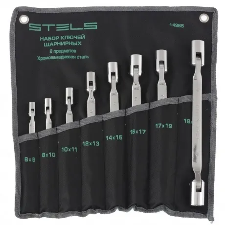 Набор шарнирных ключей Stels 14965 из стали CrV состоит из 8 шт. и предназначен для работы с болтовыми и гаечными соединениями. Включает ключи с головками размером от 8 до 19 мм с 12-гранными профилями. Они обеспечивают плотный обхват крепежа и удобны для работы в стесненных условиях — величина хода составляет всего 30 градусов. Ключи используются для ремонта автомобилей и других слесарно-монтажных работ.