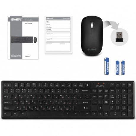 Клавиатура KB-C2550W порадует любителей компактности и комфорта, ее ножничные клавиши обеспечивают тот же уровень удобства и скорость срабатывания, что и клавиатуры ноутбуков. Пять кнопок быстрого доступа позволят «в одно касание» изменять громкость и запускать калькулятор. А целых 12 мультимедиа-клавиш, активируемых кнопкой-модификатором Fn, помогут быстро и легко управлять воспроизведением, яркостью экрана и другими параметрами. Если данные функции нужны постоянно, а кнопки F1-F12 используются реже, сочетание клавиш Fn + Esc позволяет зафиксировать режим управления мультимедиа. Отдельный цифровой блок пригодится тем, кто много работает с вычислениями, а яркая и хорошо заметная маркировка клавиш позволит легко сориентироваться в них даже тем, кто еще не успел освоить «слепую» печать. При этом для максимального удобства русские буквы выделены красным цветом. Идущая в комплекте мышь не менее интересна, чем клавиатура. Она обладает небольшим симметричным корпусом, который будет удобен правшам и левшам, клавишами с приятным кликом и надежным металлическим колесом прокрутки. Беспроводную связь устройств с ПК обеспечивает маленький USB-адаптер, работает одновременно с обоими устройствами на частоте 2,4 ГГц, гарантируя стабильное соединение. Индикатор питания позволит вовремя узнать о том, что запас энергии в батарее подходит к концу. А для его экономии предусмотрены клавиши отключения устройств, что особенно пригодится тем, кто решить носить SVEN KB-C2550W с собой — размеры и масса комплекта это вполне позволяют. Разработчики SVEN KB-C2550W сумели найти практически идеальный баланс между доступностью широкому кругу потребителей, наличием самых необходимых и популярных опций и уровнем надежности, достаточным для повседневного использования устройств в течение длительного времени. SVEN KB-C2550W уже появился на полках магазинов бытовой техники и электроники и ждет своих счастливых обладателей.