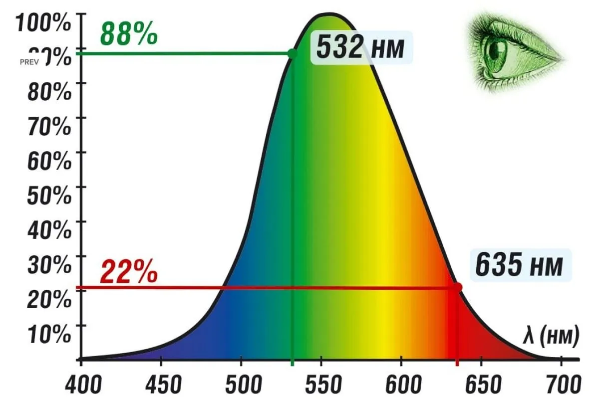 Это профессиональный расширенный комплект, включающий в себя лазерный нивелир Neo G220, настенное крепление Wall Mount pro, очки, магнитную мишень, переходник 5/8-1/4, кабельную стяжку, магнитный держатель, батарейки, руководство по эксплуатации и надежный пластиковый кейс. CONDTROL Neo G220 продолжает линию эргономичного дизайна, ставшего визитной карточкой CONDTROL. Лазерные нивелиры серии Neo защищены патентом РФ № 115069. Они отличаются от аналогов интегрированными в корпус аксессуарами, благодаря которым открывается больше возможностей использования нивелира для решения различных задач. Все нивелиры новой серии Neo G оснащены зеленым лазером с длиной волны 532 нм, которые воспринимаются в 4 раза ярче красных при одинаковой мощности излучателя. Это связано со спектральной чувствительностью человеческого зрения, что наглядно демонстрирует график.