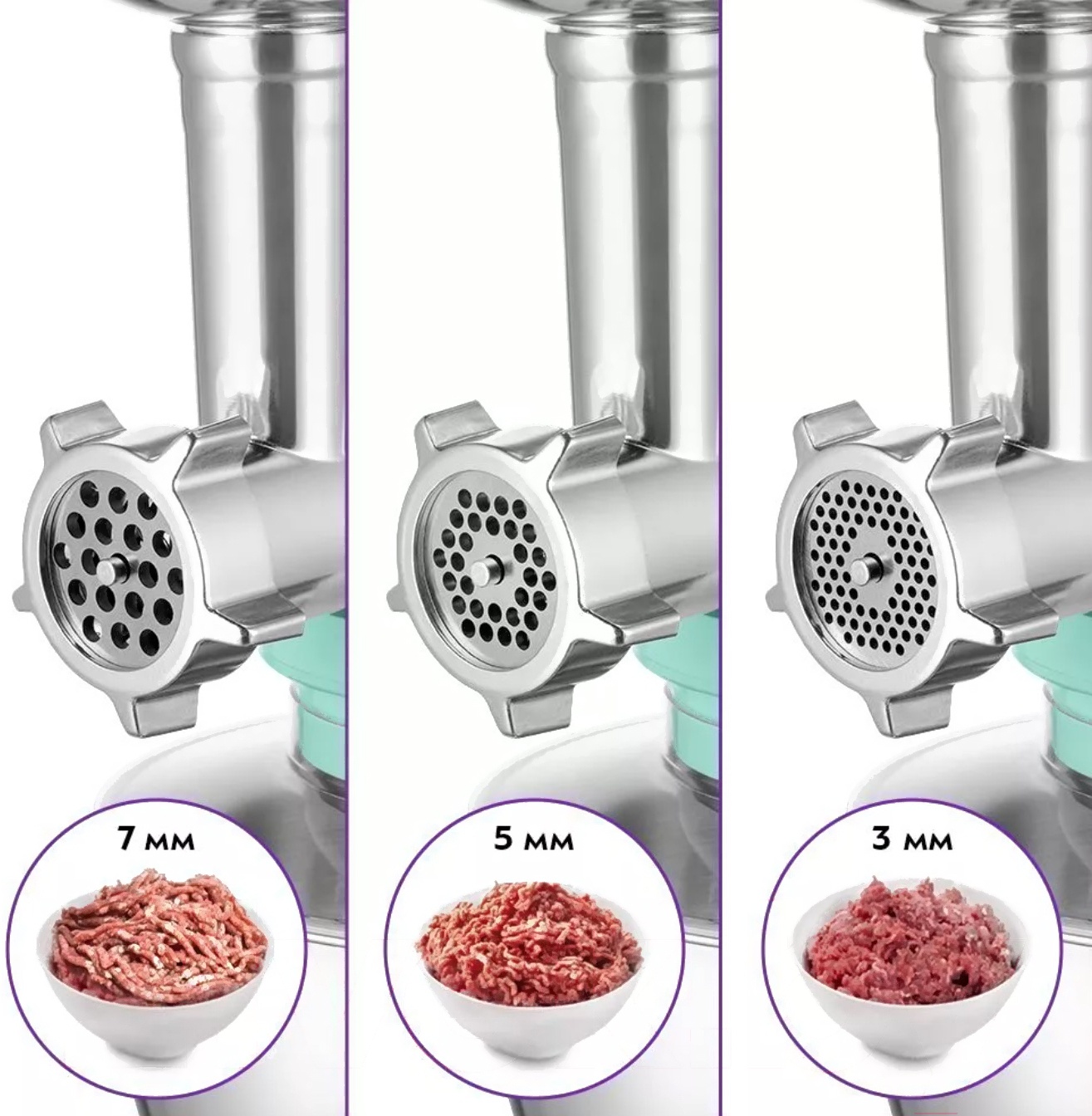 Цельнометаллический планетарный миксер КТ-3423 поможет вам смешать ингредиенты, взбить яичный белок или сливки, приготовить картофельное пюре, соус, крем, мусс, замесить жидкое тесто для блинов и крутое для пельменей и пирогов. С помощью регулятора можно установить скорость от 1 до 8. Для начала работы выберете скорость, поворачивая регулятор по часовой или против часовой стрелки. Кнопкой «Вкл/Выкл» можно остановить или продолжить работу. Индикатор скорости появится на дисплее. Чаша ёмкостью 4,3 л изготовлена из нержавеющей стали, в ней можно смешивать даже горячие ингредиенты. Во время работы насадка вращается вокруг своей оси и одновременно движется по окружности по внутреннему объёму чаши, обеспечивая идеальное смешивание. В комплекте идут венчики для взбивания яичных белков, сливок, для приготовления жидкого теста, крюк для замеса тугого теста для пельменей и пирогов, насадки для смешивания и приготовления пюре, кондитерских смесей, томатной пасты и многого другого. В металлической чаше можно смешивать даже горячие ингредиенты. Съёмная крышка предотвращает разбрызгивание ингредиентов при взбивании. Через загрузочное отверстие можно добавлять ингредиенты прямо во время работы миксера. В комплекте с миксером идёт насадка-мясорубка с широким загрузочным лотком с производительностью 1 кг фарша в минуту. Решётки различного диаметра и позволят сделать как котлеты и бифштексы, так и нежнейшие фрикадельки, например, для детского питания. Насадки для колбас и кеббе используются для приготовления колбасок. Фигурная насадка используется для приготовления различных изделий из теста. Блендер оснащён стеклянной чашей ёмкостью 1,5 л с мерной шкалой. Он с лёгкостью справится со смешиванием разных продуктов и колкой льда. В крышке блендера есть отверстие для добавления ингредиентов во время работы, оно закрывается колпачком. Благодаря овощерезке устройство поможет с тёркой и шинковкой овощей, фруктов и других пищевых продуктов в домашних условиях. В комплекте с овощерезкой идут 5 насадок. Они подходят для нарезки тонких и толстых ломтиков или соломки. Вместе с устройством в комплекте идёт широкий ассортимент различных насадок. Все комплектующие легко снимаются и очищаются.