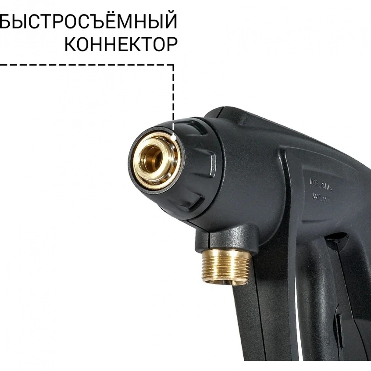 Компактный пистолет, предназначенный для работы в труднодоступных местах для удобства маневрирования и мобильности. Подключается к шлангу резьбой М22х1,5, подключение насадок стандартный QUICK FIX. Курок имеет блокировку от случайного нажатия. Ручка имеет прорезиненных хват.