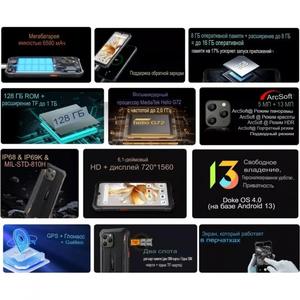 Смартфон Blackview BV5300 Plus имеет 8 Гб оперативной памяти, что довольно много. Случаев нехватки памяти практически никогда не будет, поэтому смартфон, помимо своей фирменной прочности, подходит для мультизадачности.. Вместимость хранилища данных устройства составляет 128 Гб и такой смартфон крайне рекомендуется для тех, кто часто снимает видеоролики и делает фотографии. Он подходит для создания фото и видео, и даже если вы установите много приложений и игр, вы не почувствуете неудобства. Смартфон совместим с картами SD, так что вы легко сможете увеличить объём его памяти.. У смартфона Blackview BV5300 Plus диагональ дисплея составляет 6.1 дюйма, IPS-матрица с разрешением HD+, стандартной частотой обновления 60 Гц и поддержкой работы в перчатках. Несмотря на тройной блок, смартфон обладает всего одной задней камерой, её разрешение составляет 13 Мп. Также, смартфон имеет фронтальную камеру 4.98 мегапикселей, что является средним показателем для камер смартфонов.. Blackview BV5300 Plus стал первым смартфоном, построенным на базе процессора Mediatek Helio G72, имеющим 8 ядер и тактовую частоту 2.0 ГГц. Ёмкость аккумулятора Blackview BV5300 Plus составляет 6580 мАч, что является очень большим показателем. В сравнении с другими смартфонами, батарея Blackview BV5300 Plus живет очень долго. С такой ёмкостью вы будете приятно удивлены сроком жизни аккумулятора. Даже если вы долгое время смотрите видео или играете в игры, у вас не возникнет проблем с батареей.