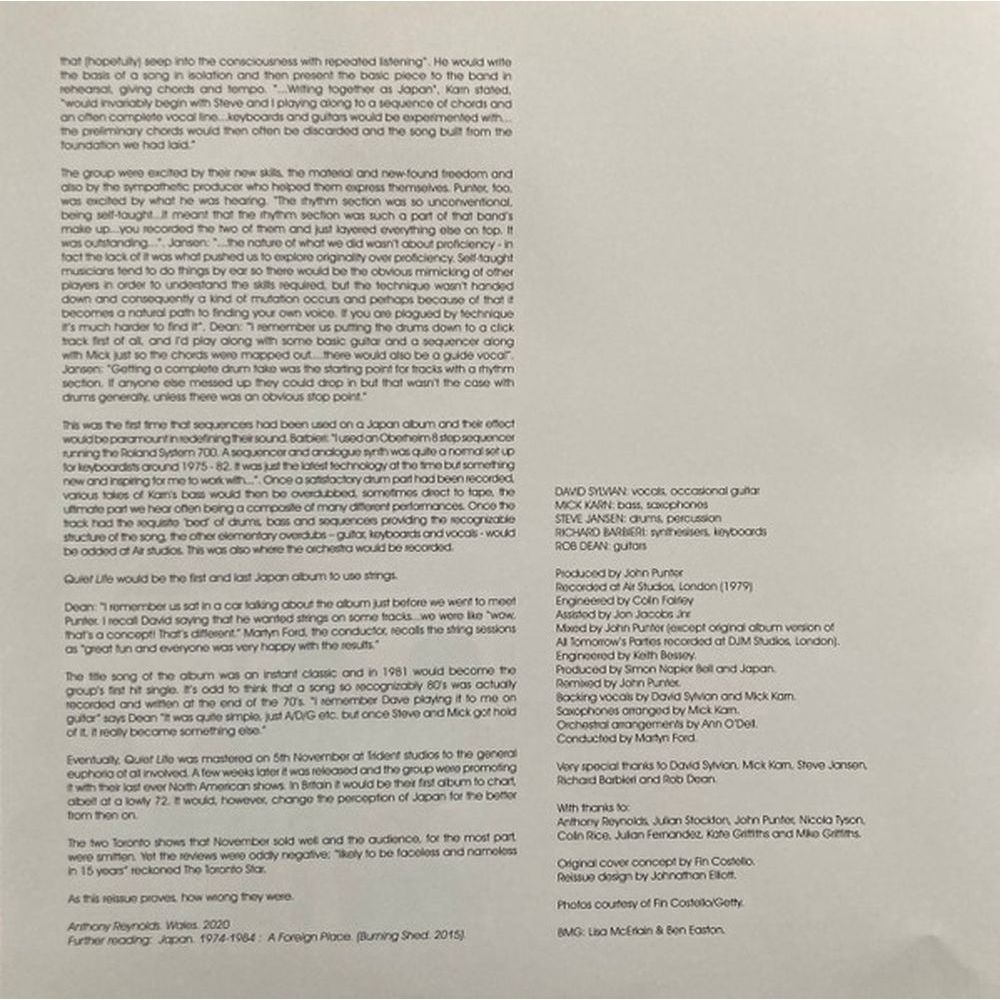 "Quiet Life" - третий студийный альбом группы Japan, выпущенный в 1979 году сначала в Японии, Германии и Канаде и в 1980 года в Великобритании. Музыкально, альбом был переходом группы от глэм-рока двух предыдущих альбомов к синти-поп-музыке. Ремастированное с помощью технологии Half-Speed Mastering переиздание на цветном 180-граммовом красном виниле. Британская группа "новой волны" Japan была основана в 1974 году и просуществовала до 1982. Уважаемый портал Allmusic назвал их "самым захватывающим и успешным коллективом своего времени". Музыканты начинали с исполнения глэм-рока, хотя позже создали свою разновидность синти-попа с чувствительной примесью фанк-рока. Все пять оригинальных пластинок получили большой успех в Британии и завоевали золотой продажный статус. В 1990-1991 годах группа ненадолго собралась вновь и выпустила новый альбом который, однако, успеха не имел.