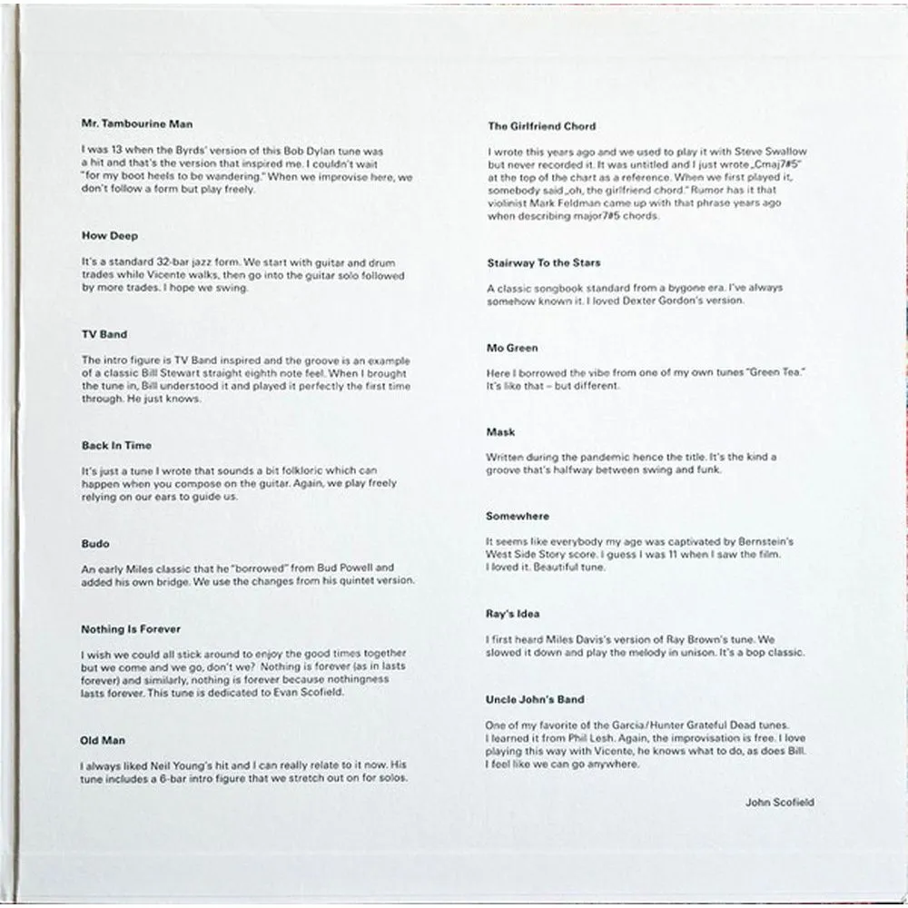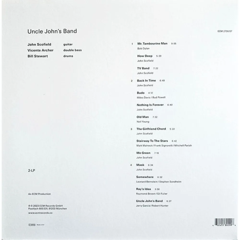 Названный в честь песни Grateful Dead, завершающей этот вдохновенный двойной альбом, Uncle John's Band включает в себя мастерского гитариста Джона Скофилда в его самых вольных проявлениях. В широком репертуаре его трио с Висенте Арчером и Биллом Стюартом исполняет материал от «Mr Tambourine Man» Дилана до «Old Man» Нила Янга, от «Somewhere» Леонарда Бернстайна до классического «Budo» Майлза Дэвиса. А джазовые стандарты, включая «Stairway to the Stars» и «Ray's Idea», соседствуют с семью оригинальными произведениями Скоуфилда, в которых присутствуют различные элементы свинга, фанка и фолка. Красной нитью через всю программу проходит потрясающий импровизационный энтузиазм трио. «Я чувствую, что мы можем пойти куда угодно», — говорит Джон Скофилд о разнонаправленности группы.
