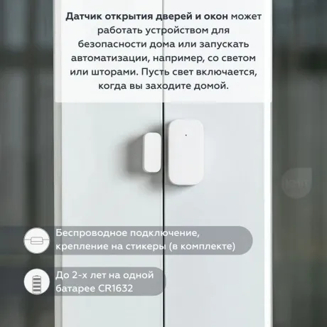 Встроенный высокоточный геркон для точного определения состояния открытия и закрытия дверей и окон, выполнение сценариев в составе систем умного дома. Беспроводная работа с Центром умного дома Aqara