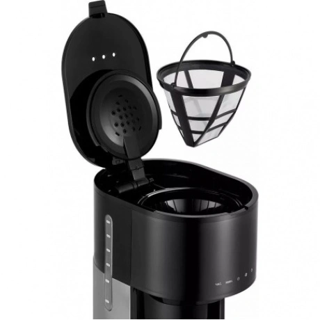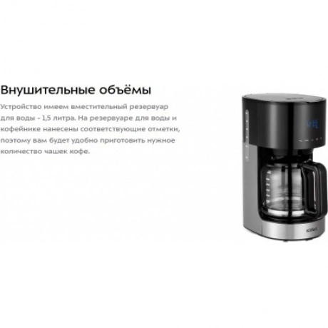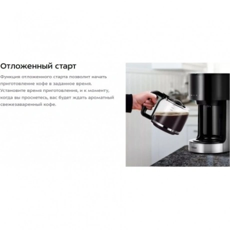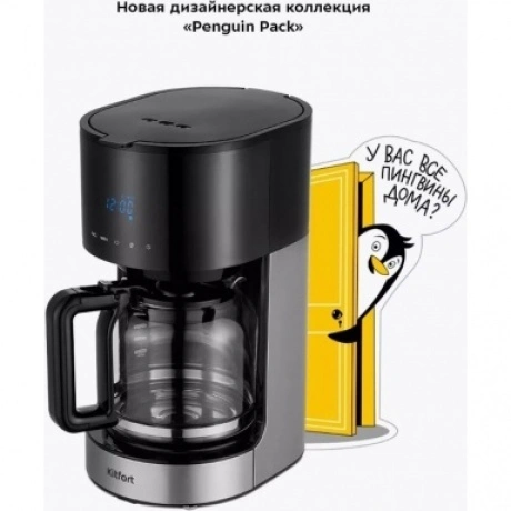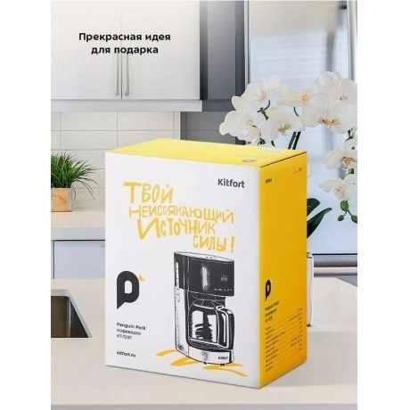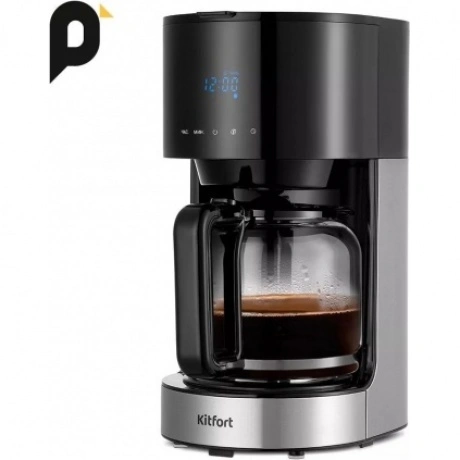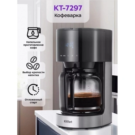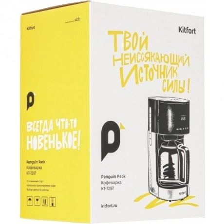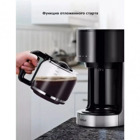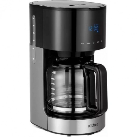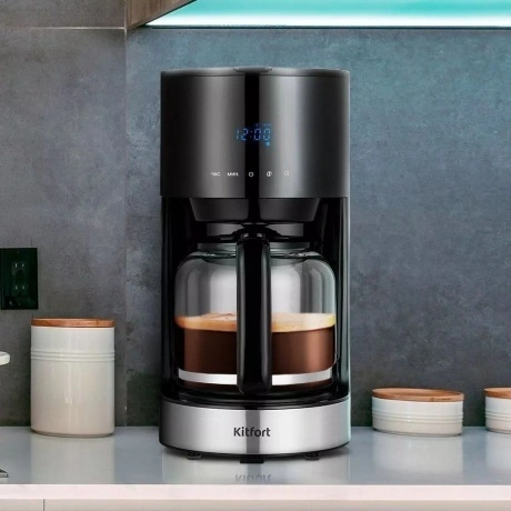 Кофеварка капельная Kitfort КТ-7297 в пластиковом корпусе черного цвета комплектуется стеклянной колбой объемом 1.5 л, внутрь которой поступает сваренный кофе. Предупредить попадание посторонних примесей в напиток позволяет нейлоновый фильтр. Сенсорная панель управления служит для выбора температуры, объема воды, порции кофе. Kitfort КТ-7297 поддерживает режим отложенного запуска для начала работы в заданный временной интервал. Выбранные параметры транслируются на встроенном дисплее. При подключении к сети используется 0.7-метровый кабель. Ножки в основании устойчиво фиксируют прибор на любой поверхности.