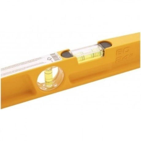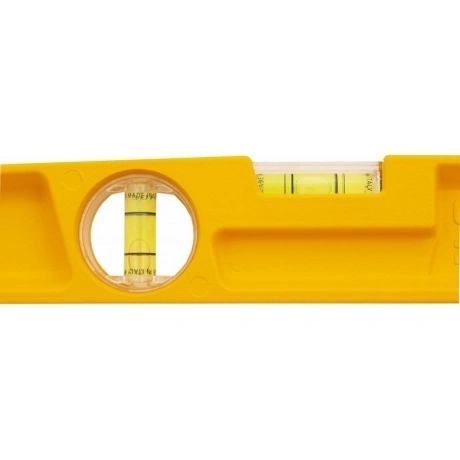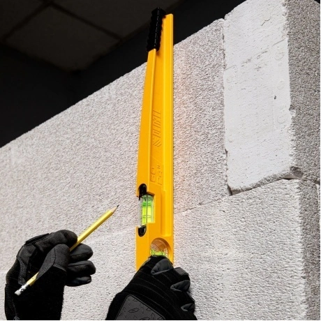 Литой уровень Denzel 34935 длиной 600 мм, с 2 глазками и ударными площадками, поможет выполнить максимально точные измерения в горизонтальной и вертикальной плоскостях. Благодаря инструменту значительно ускоряется и упрощается монтаж конструкций, укладка плитки, брусчатки и т. д. Для определения отклонения вертикали 90 градусов необходимо использовать пузырьковую ампулу только в верхнем положении уровня. Только базовая поверхность является рабочей (противоположная ампуле 180 градусов).