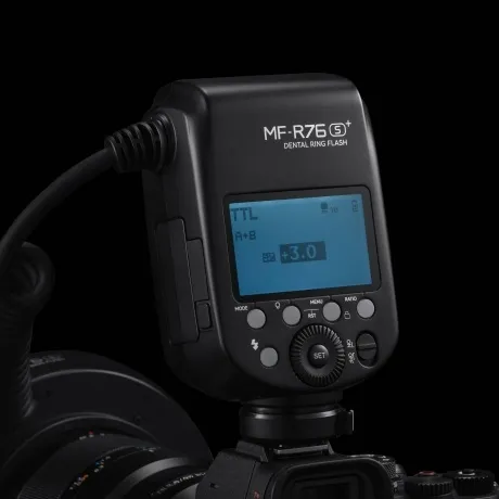 MF-R76S+ кольцевая макровспышка, разработанная специально для дентальной фотофиксации: за счет калиброванного автоматического режима TTL вспышка обеспечивает оптимальное освещение всей полости рта. MF-R76S + поможет делать снимки на разных этапах стоматологического лечения, чтобы легко сравнивать прогресс пациента. Макровспышка состоит из двух компонентов: контроллера, который вставляется в крепление «горячий башмак» DLSR-камеры, и кольцевой вспышки, которая крепится к объективу. Таким образом вспышка создает мягкое и равномерной освещение, устраняя нежелательное виньетирование и тени для качественной интраоральной и экстраоральной съемки.