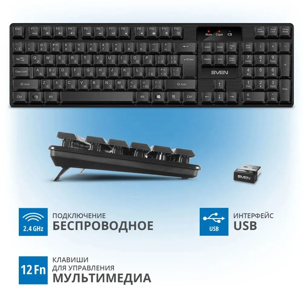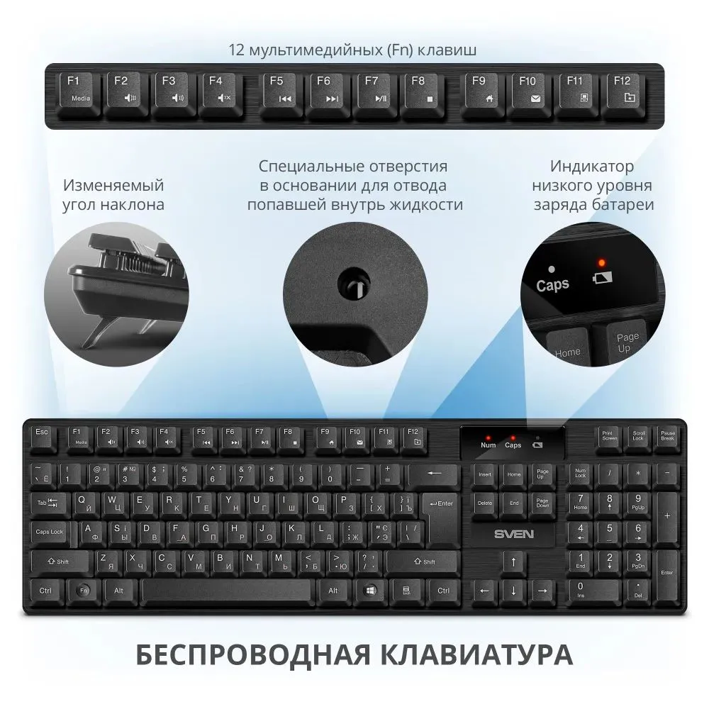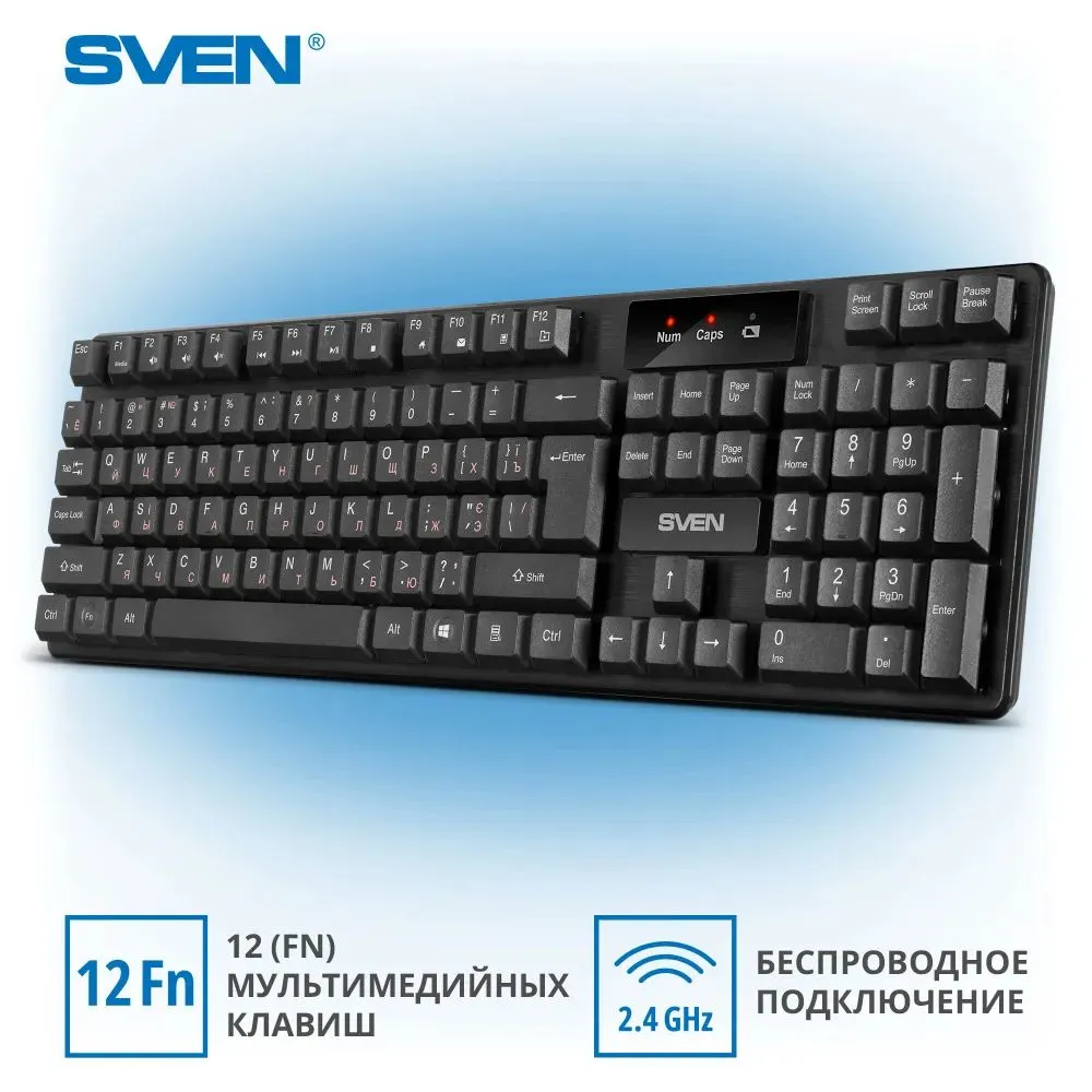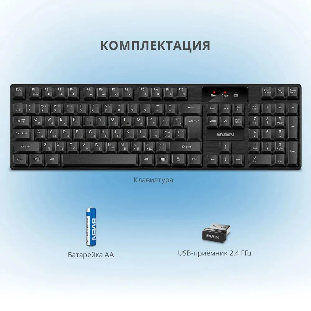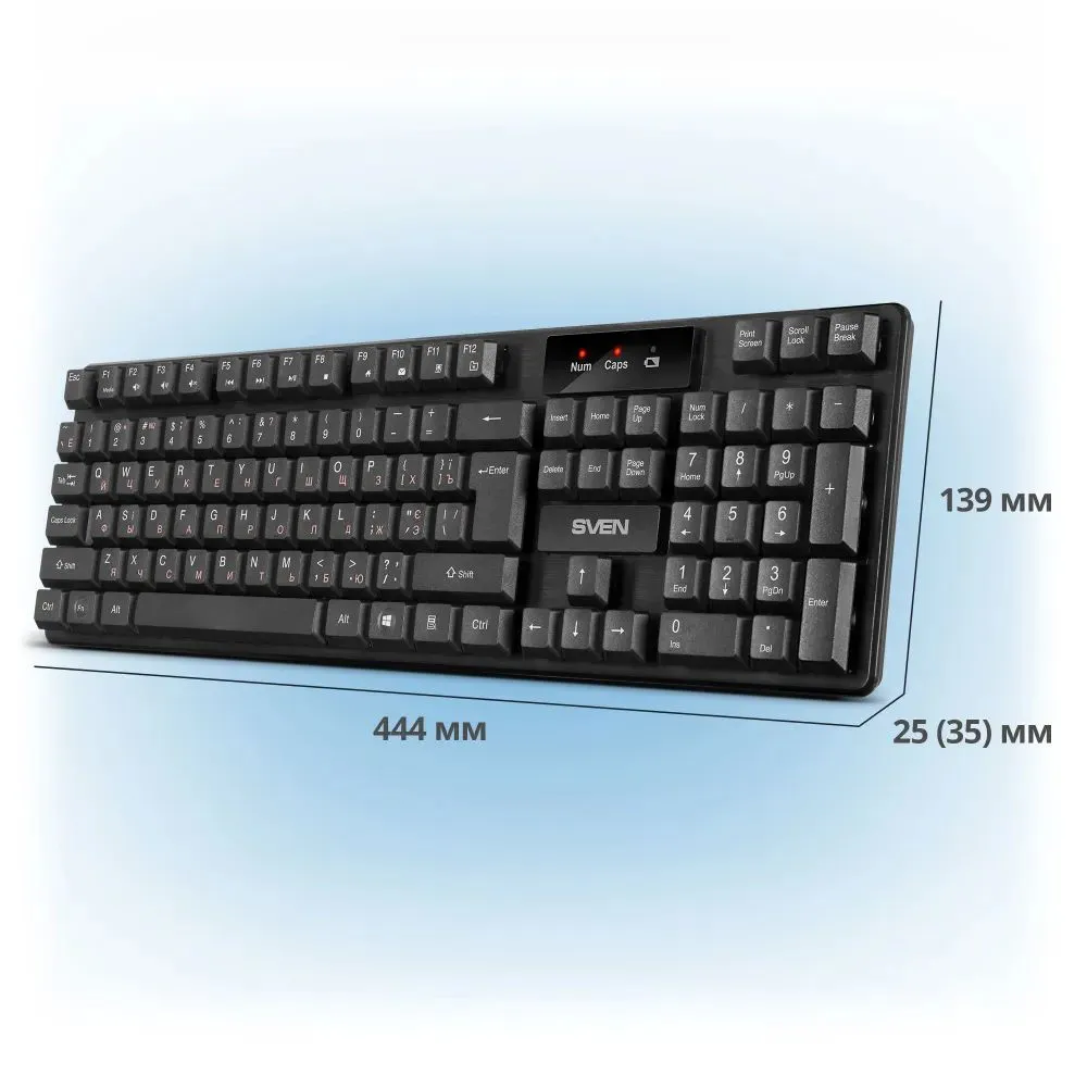 Удобная, беспроводная и доступная — вот главные достоинства клавиатуры SVEN, предназначенной для работы и учебы. SVEN KB-C2300W имеет стандартную раскладку из 104 клавиш с приятным мягким ходом, при этом она приятна в использовании и поместится даже на небольшом столе. Символы на клавиши нанесены качественной краской, русские буквы выделены красным цветом — при печати будет легко сориентироваться пользователям даже с небольшим опытом работы с ПК и разной остротой зрения. Кроме того, клавиатура оснащена удобной «двухэтажной» клавишей Enter и длинными кнопками Shift. Ну и, конечно, есть у KB-C2300W отдельный цифровой блок, без которого не могут представить свою работу и учебу те, чья деятельность связана с вычислениями.