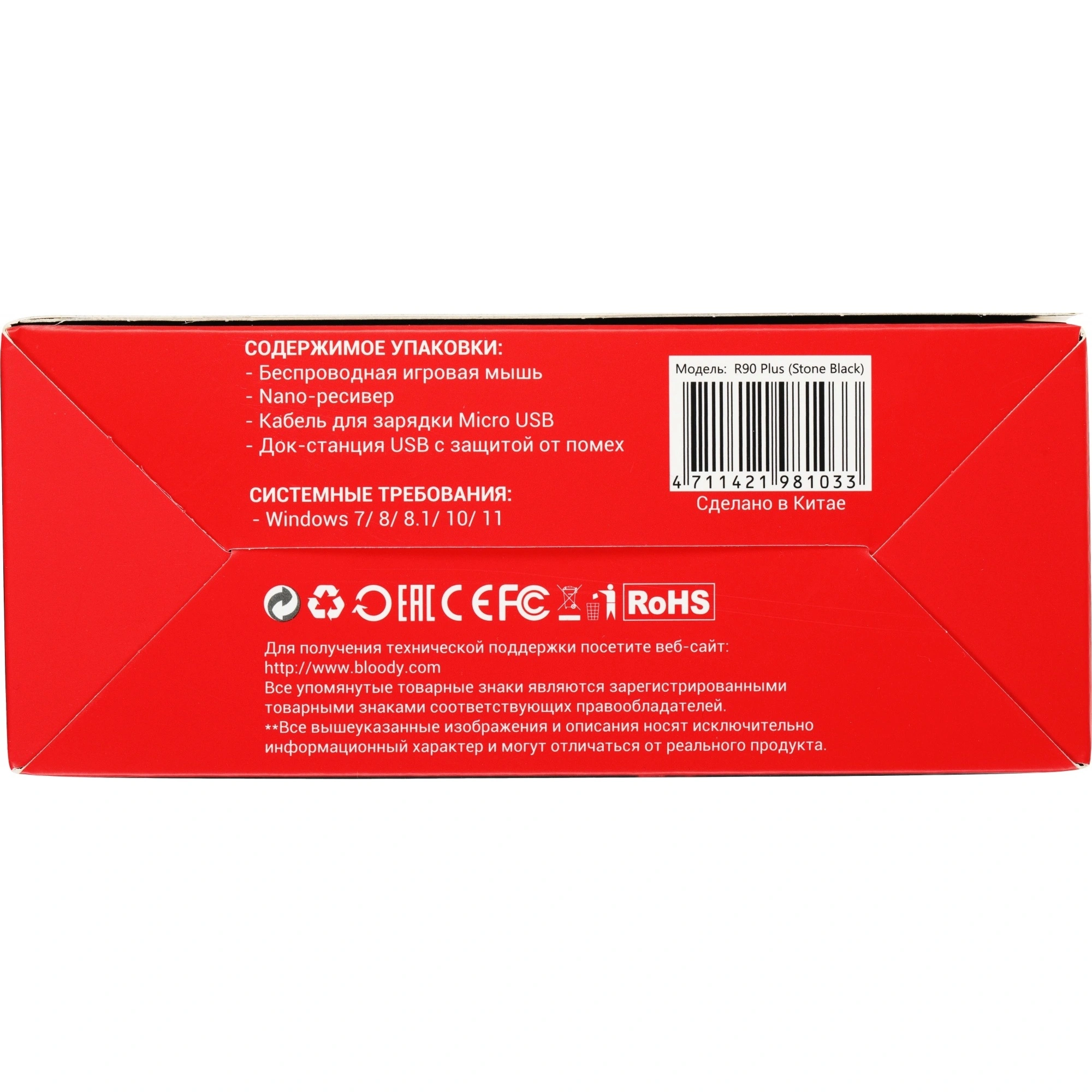 Беспроводная мышь A4Tech Bloody R90 Plus получила в свое оснащение металлические ножки X'Glide, отличающиеся прочностью, чувствительностью и способностью устранять трение при использовании манипулятора практически на любой поверхности. По своей форме и весу устройство идеально подходит для управления правой рукой. В основе безупречной работы мыши лежит оптический светодиодный сенсор BC3332-S, максимальное разрешение которого достигает 5000 dpi.