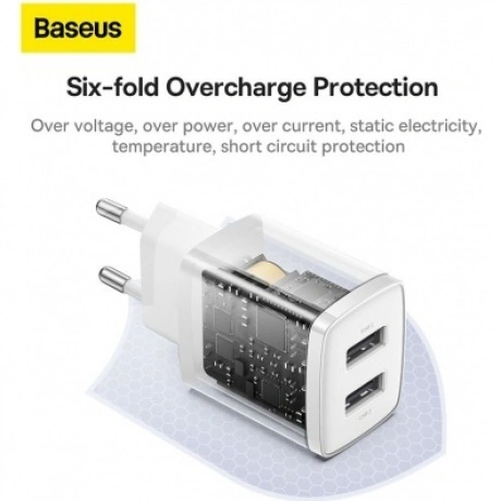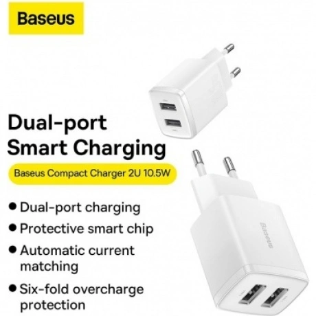 Универсальное зарядное устройство Baseus Compact Charger 2U 10.5W выполнено в невероятно компактных размерах и весит всего 41.2 грамма. Такое зарядное удобно брать с собой в командировку и путешествие. А еще у него два выходных USB-порта, которые могут работать одновременно. С его помощью вы зарядите сразу два гаджета от одной розетки. Многоуровневая система защит, в том числе от перегрева, обеспечивает безопасную зарядку устройств. Встроенный интеллектуальный чип автоматически определяет каждое подключенное устройство и подбирает для каждого оптимальные выходные параметры. Работает оно от сети с напряжением от 100 до 240 В и подходит для зарядки большинства гаджетов.
