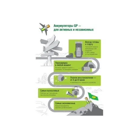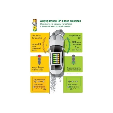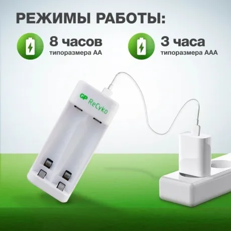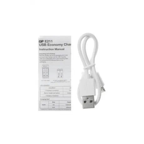Зарядное устройство GP E211 предусматривает получение питания от порта USB и обеспечивает эффективный процесс восстановления энергоресурса аккумуляторных батареек. Данное устройство оснащено двумя индивидуальными слотами для установки элементов питания типоразмера AA/AAA с электролитом Ni-MH. Световой индикатор на корпусе помогает контролировать состояние зарядки. После достижения полного заряда подача энергии автоматически прекращается. Таймер безопасности и контроль неисправности гарантируют удобство в пользовании GP E211.