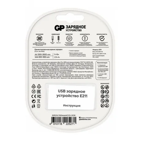 Описание товара Зарядное устройство GP Е211 с 2 аккумуляторами ААА750